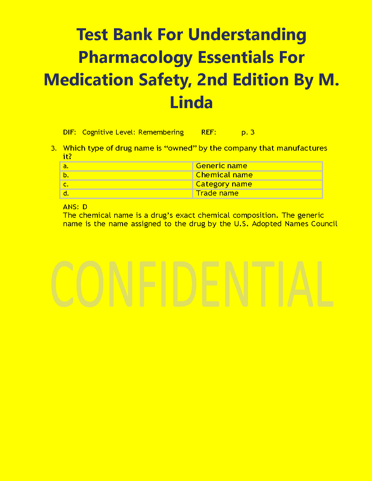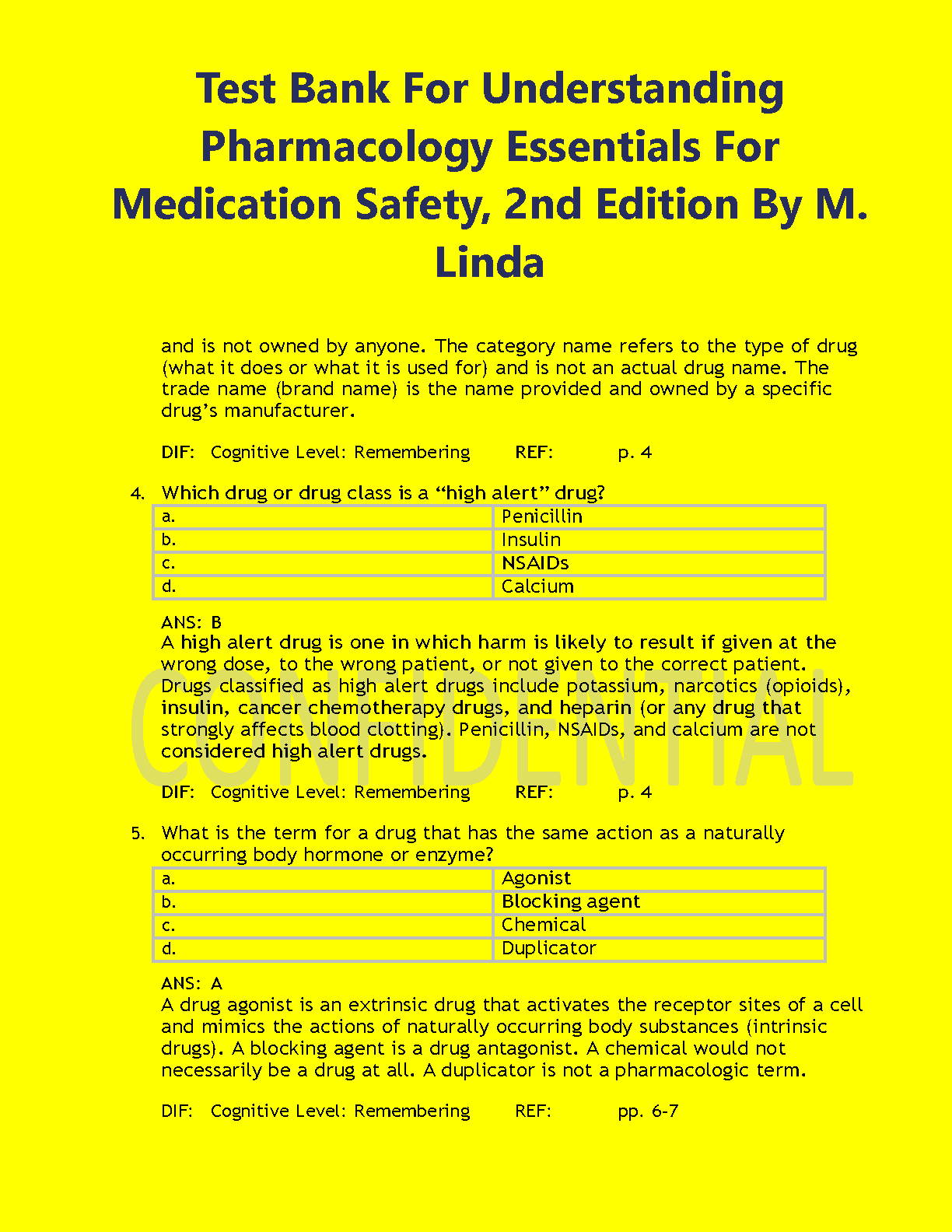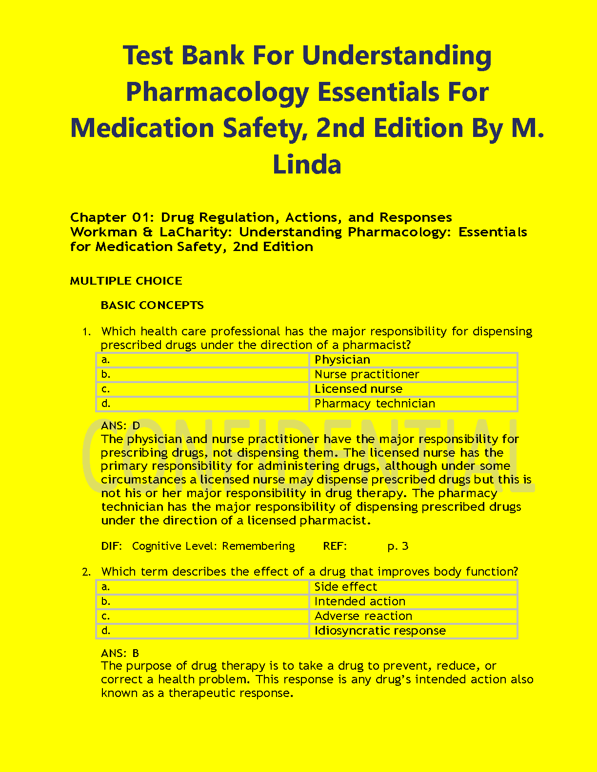 This comprehensive Test Bank for "Understanding Pharmacology: Essentials for Medication Safety" by M. Linda Workman & LaCharity, 2nd Edition, provides a robust set of practice questions designed to enhance your understanding and retention of essential pharmacology concepts. With a focus on medication safety and relevant clinical scenarios, these questions help you prepare effectively for exams and confidently navigate the complexities of pharmacology in your healthcare practice.