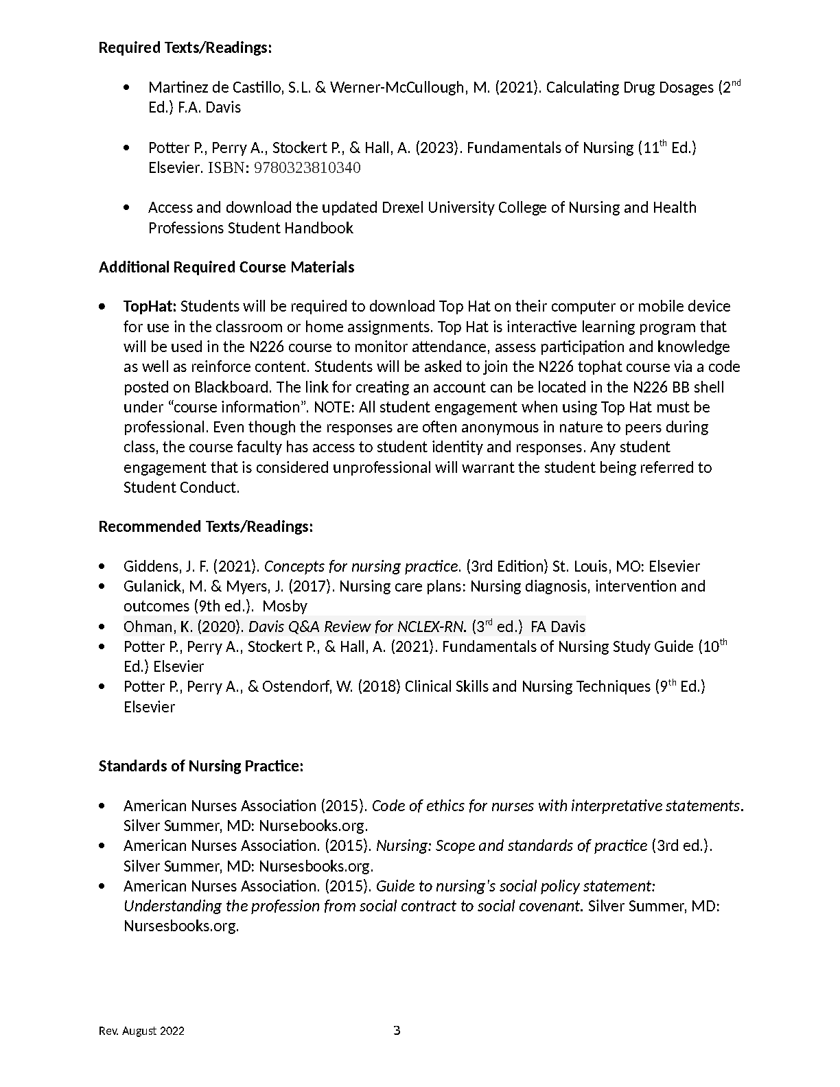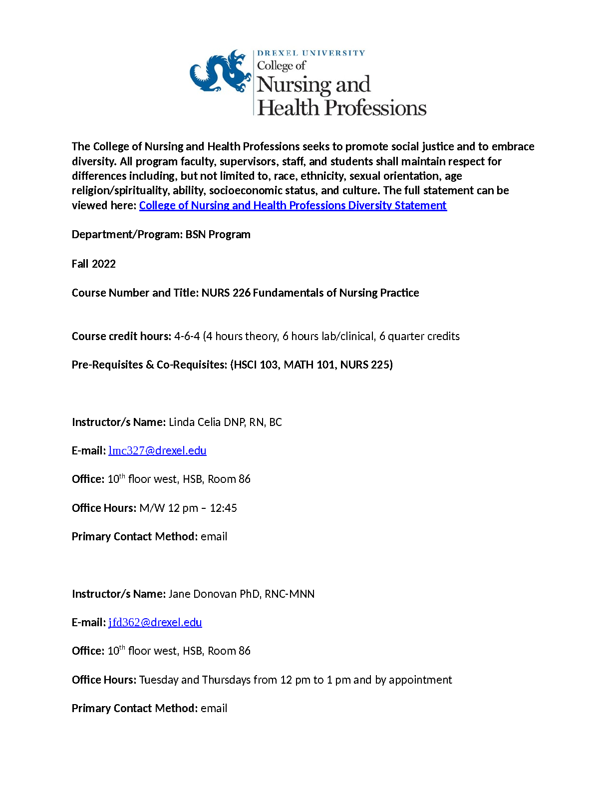 Nurs 226 Fundamentals of Nursing Practice - Linda Celia DNP, RN, BC and Jane Donovan PhD, RNC-MNN