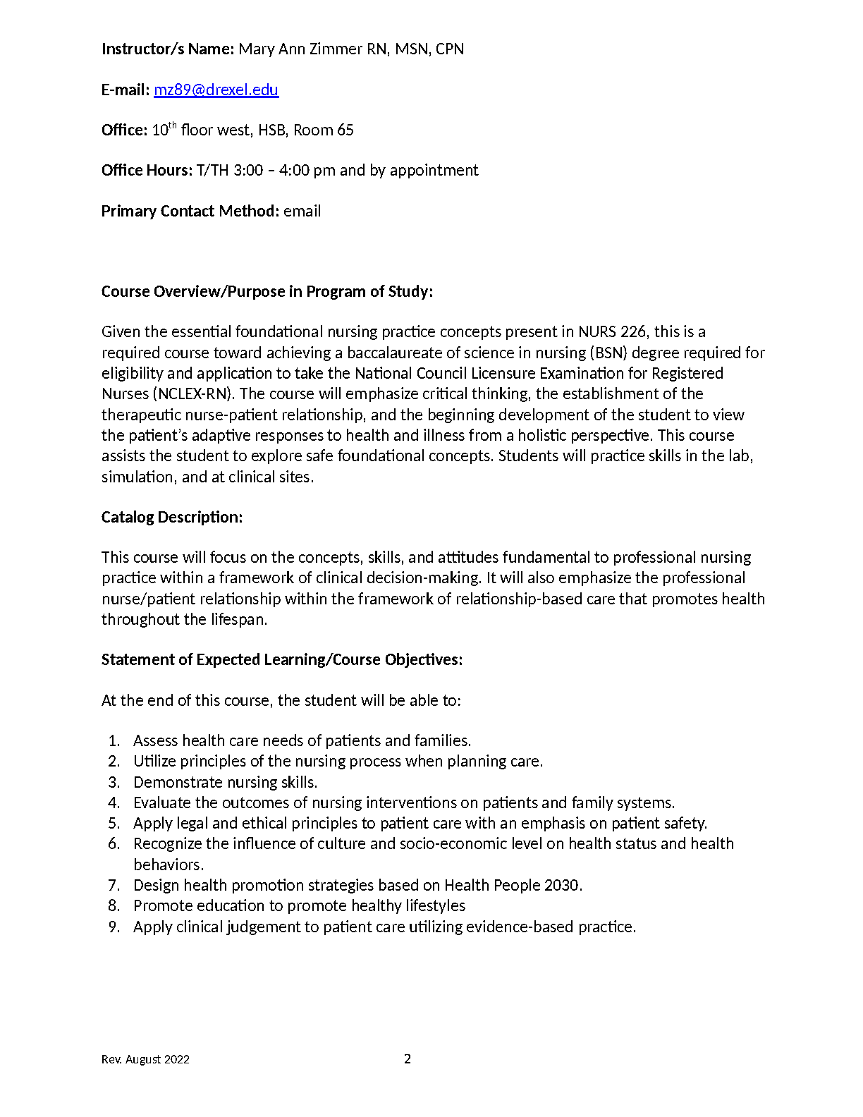 This is a course syllabus for Nurs 226 Fundamentals of Nursing Practice. It contains information about the course, instructors, prerequisites, co-requisites, and contact information.