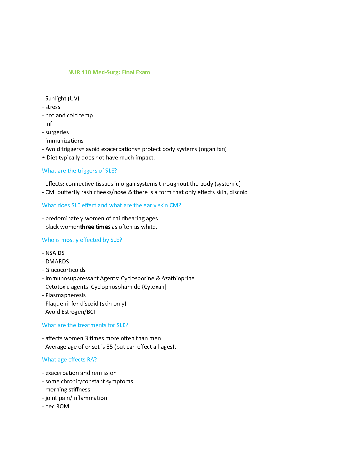 Ace your NUR 410 Med-Surg final exam with this comprehensive resource! This study guide covers key concepts of medical-surgical nursing, including triggers of SLE, treatments, and age-related effects. Prepare for exam success and avoid resits with this essential guide!
