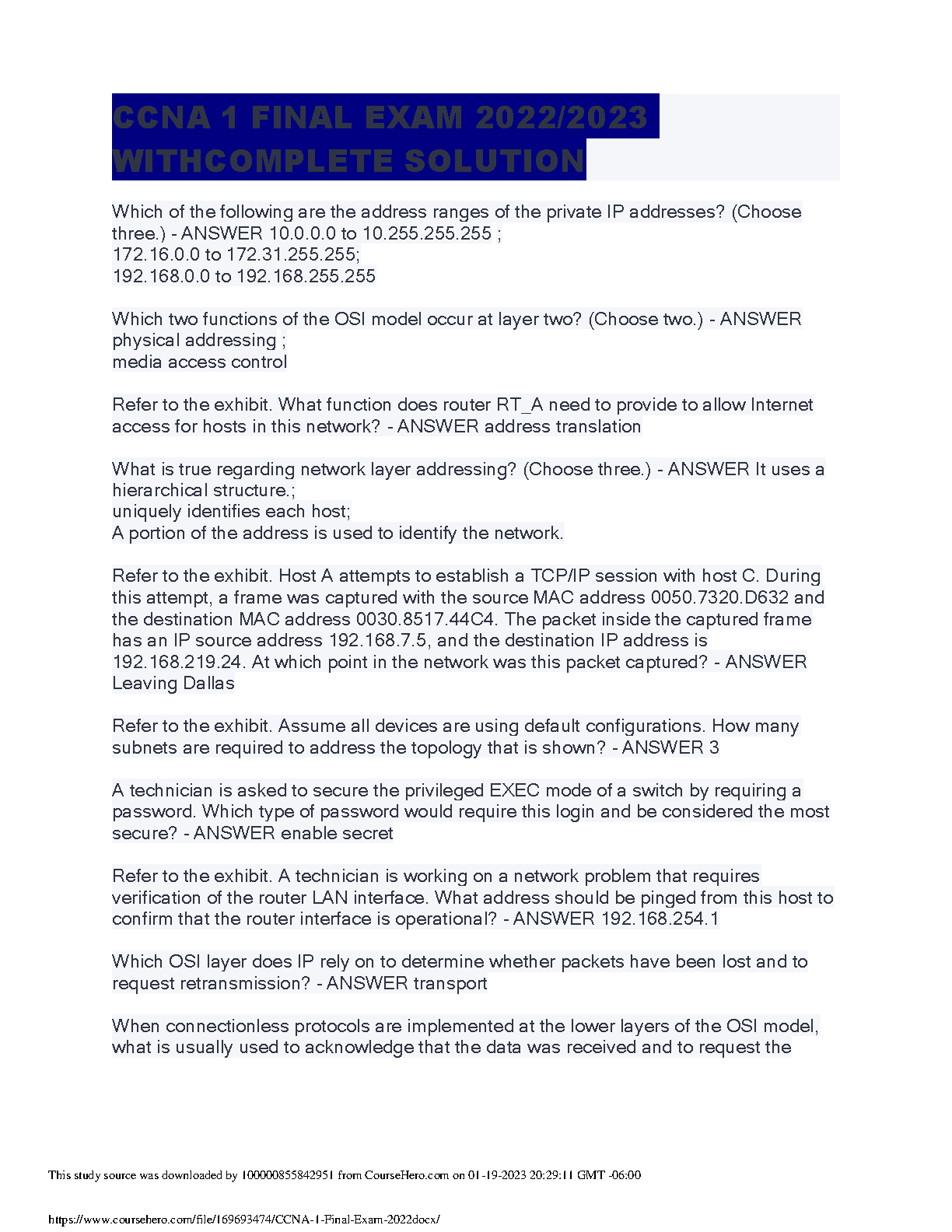 CCNA 1 Final Exam 2022/2023 with Complete Solution by Cisco