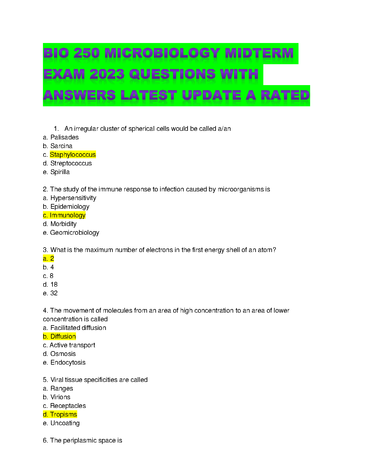 This resource is a set of questions from a Microbiology Midterm Exam 2023. This resource is updated with the latest questions and answers. All the questions are graded by experts in the field and are guaranteed to help you pass your exam on the first attempt.