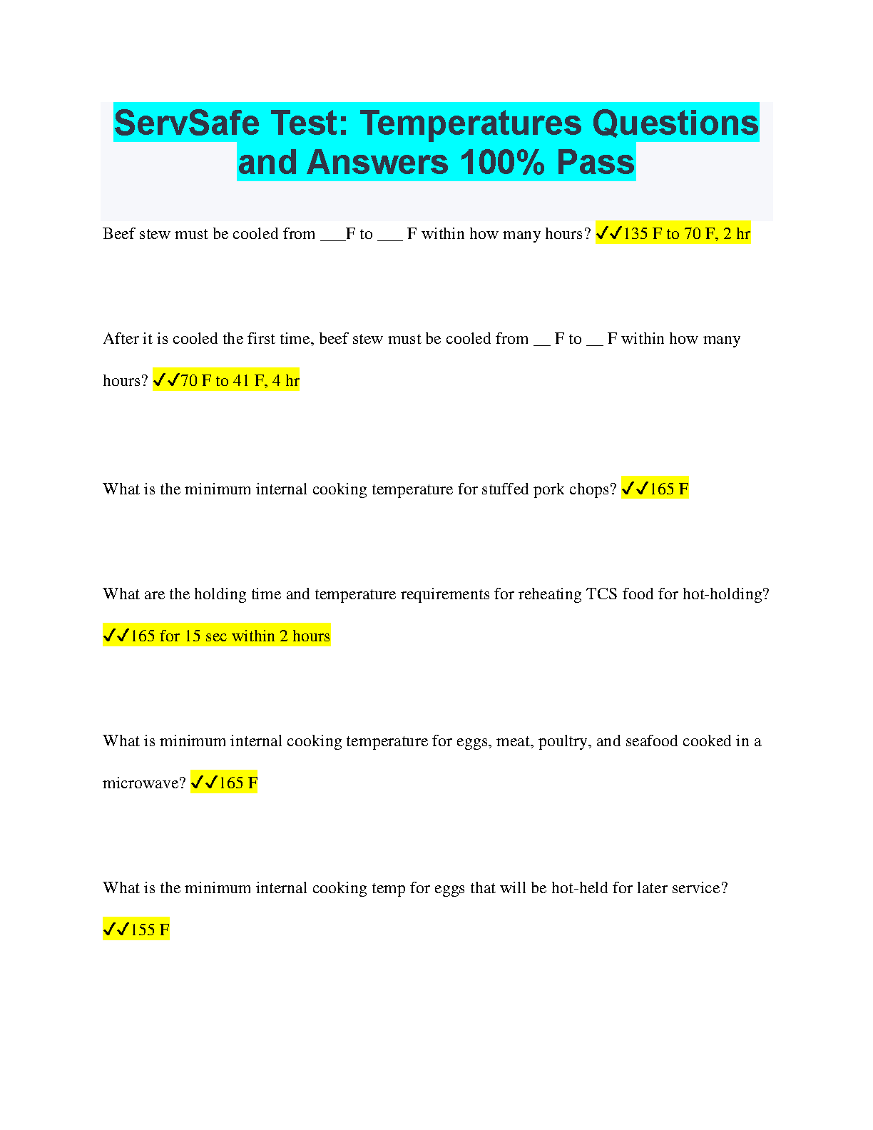 This comprehensive resource contains a collection of ServSafe Test questions and answers specifically focused on temperature regulations, ensuring you are well-prepared to pass your exam with confidence. Covering a wide range of topics from food holding times to internal cooking temperatures, this guide provides the essential knowledge to avoid resits and achieve your ServSafe certification.