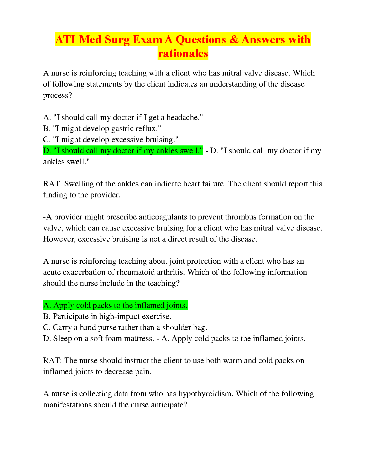 ATI Med Surg Exam A Questions & Answers with Rationales - 2024/2025 Edition - Pass Your Exam on the First Try!