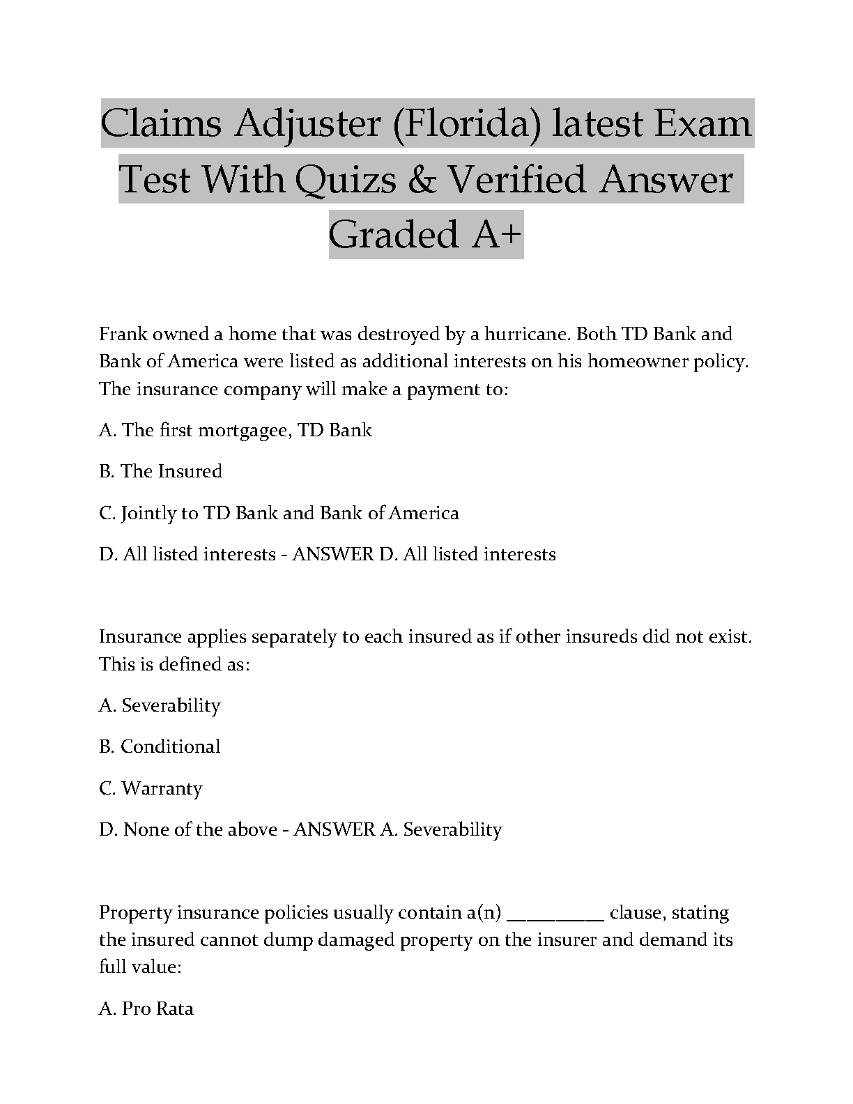 Ace your Claims Adjuster (Florida) exam on the first attempt with this comprehensive study guide. Get access to verified answers, practice quizzes, and a graded A+ study experience.