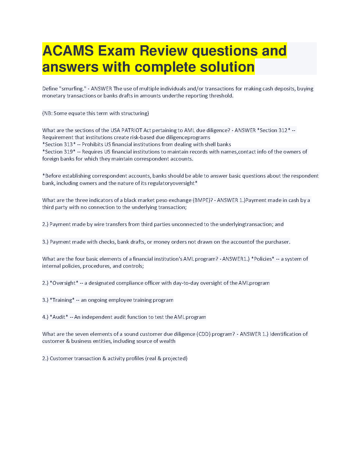 Ace your ACAMS exam with this comprehensive review guide, featuring all the latest exam questions and complete solutions for 2024/2025. This resource is designed to help you avoid resits and pass on your first attempt!