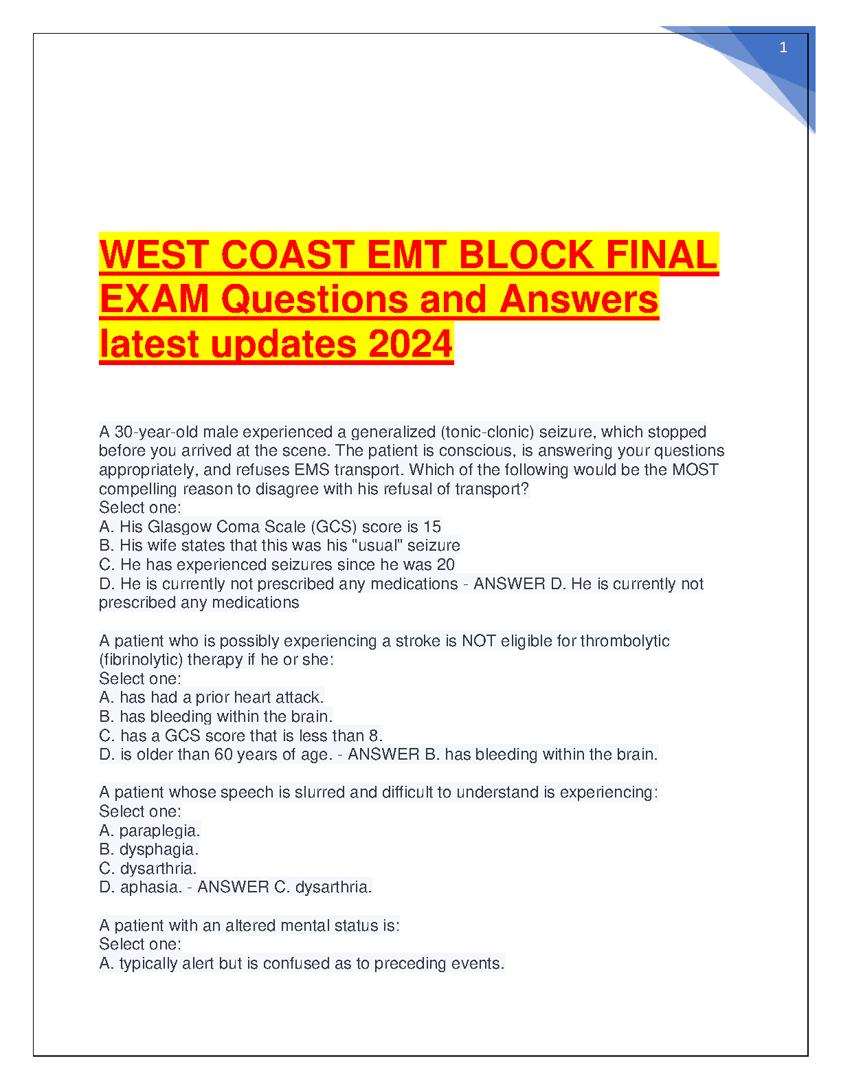 West Coast EMT Block Final Exam Questions and Answers 2024: Latest Updates for Success