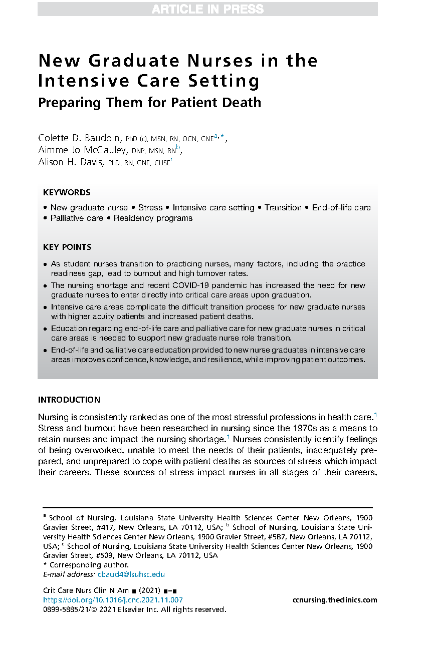 New Graduate Nurses in the Intensive Care Setting: Preparing Them for Patient Death by Colette D. Baudoin, Aimme Jo McCauley, Alison H. Davis