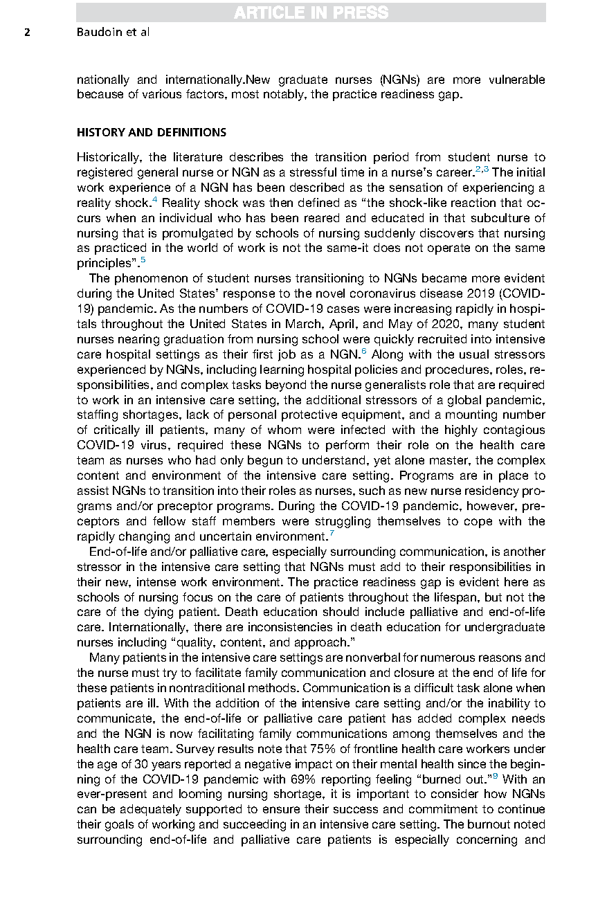 This article discusses the challenges faced by new graduate nurses in intensive care settings. It highlights the importance of providing specialized education and support to help these nurses cope with the difficult transition from student to practicing nurse, particularly in the context of patient death.