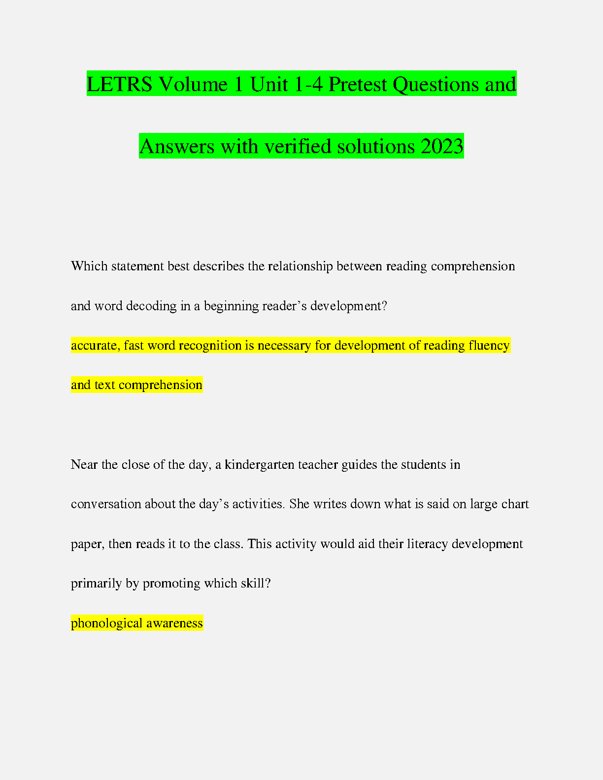 LETRS Volume 1 Unit 1-4 Pretest Questions and Answers with Verified Solutions 2023 - Boost your understanding of the LETRS program with detailed answers to all pretest questions. This resource is designed to help you grasp key concepts and prepare for success in your LETRS studies.