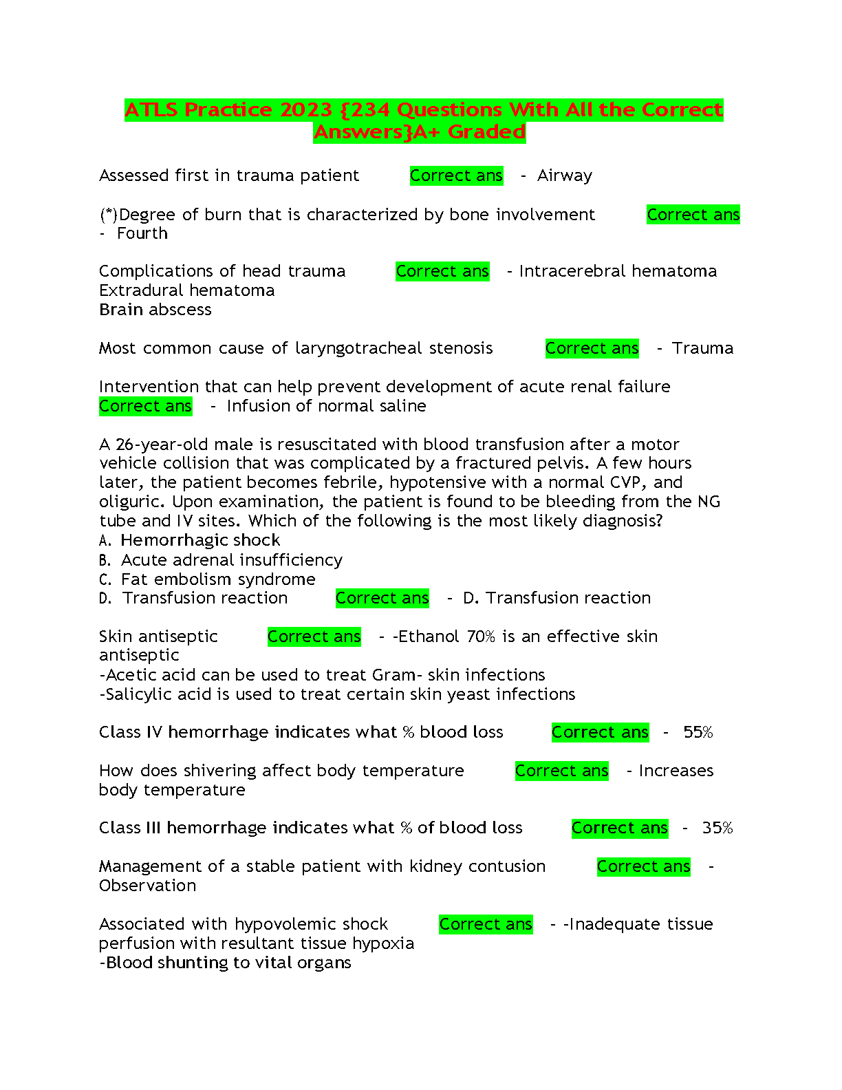 ATLS Practice 2023 (234 Questions) With All the Correct Answers 3A+ Graded