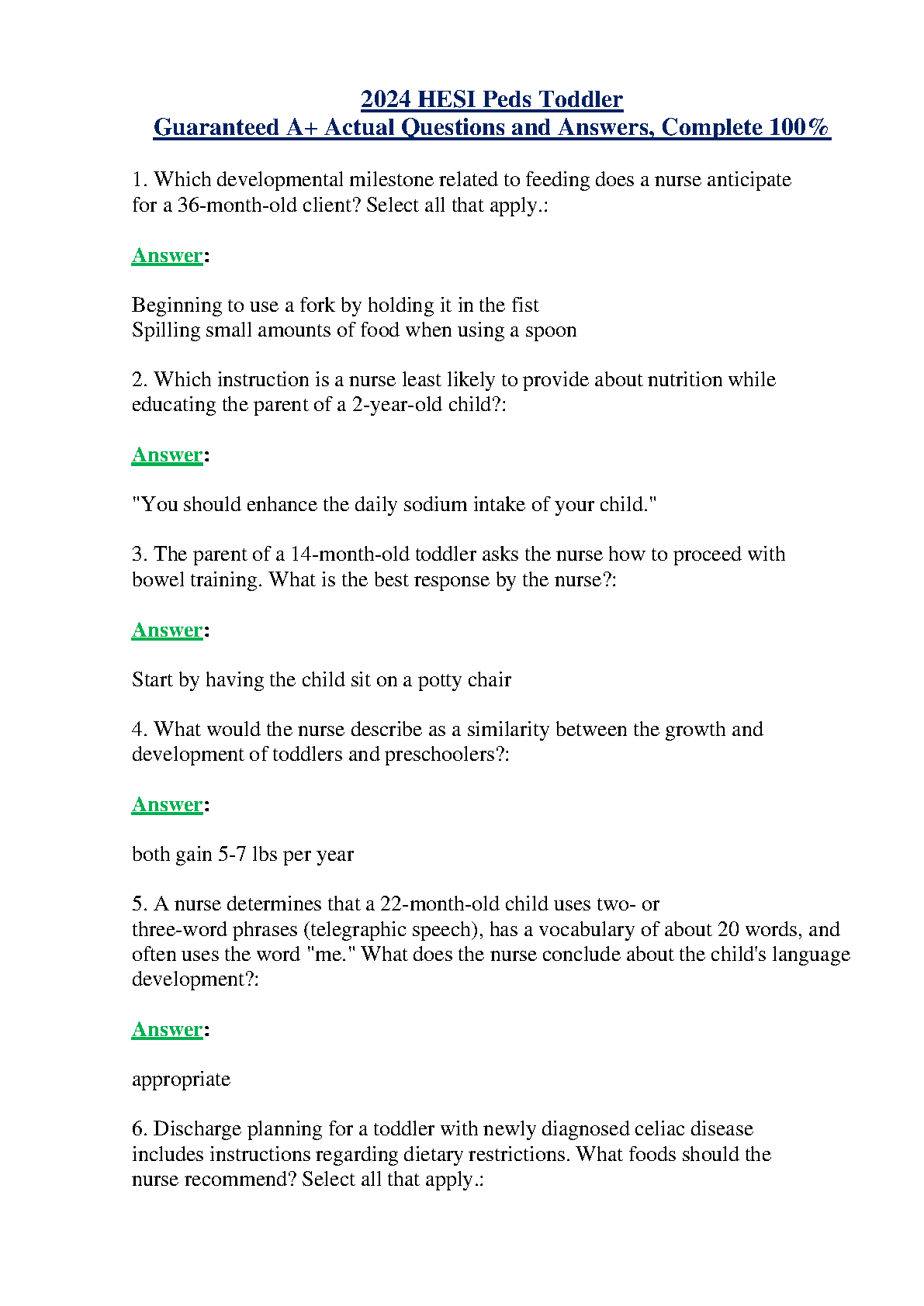 2024 HESI Peds Toddler Actual Questions and Answers by Linda Anne Silvestri, RN, MSN, CCRN, CEN, CPHON, - Complete 100% Guaranteed A+