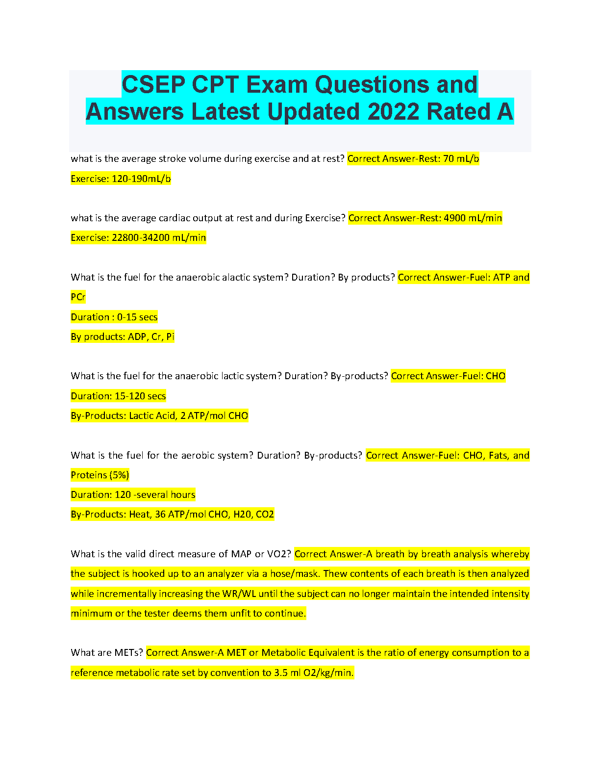 CSEP CPT Exam Questions and Answers Latest Updated 2022 Rated A by Dr. Stephen L. Kearney, Michael J. Flynn, Dr. William J. Kraemer, Douglas Cosgrove, Dr. James H. Wilmore, and Dr. David L. Costill