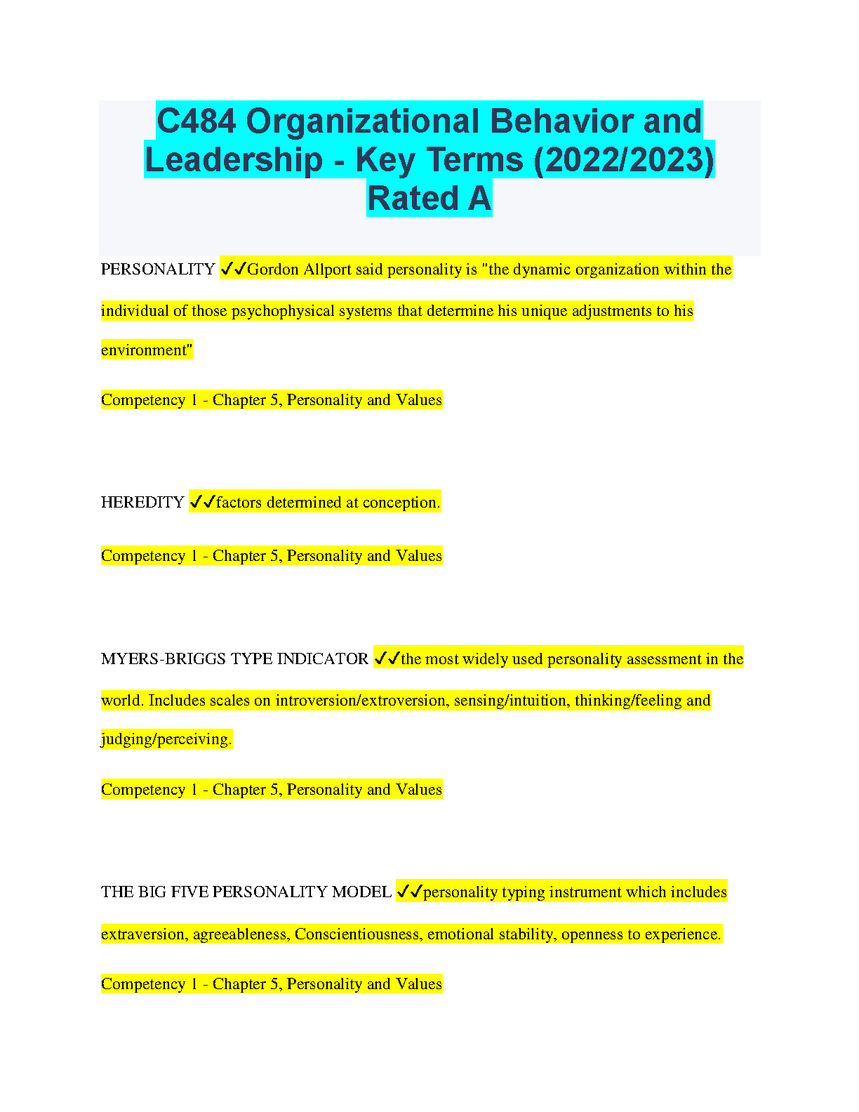 This resource contains key terms for C484 Organizational Behavior and Leadership - Key Terms (2022/2023) Rated A. It covers topics such as personality, heredity, Myers-Briggs Type Indicator, and the Big Five Personality Model. This resource is designed to help students ace their exams on their first attempt.