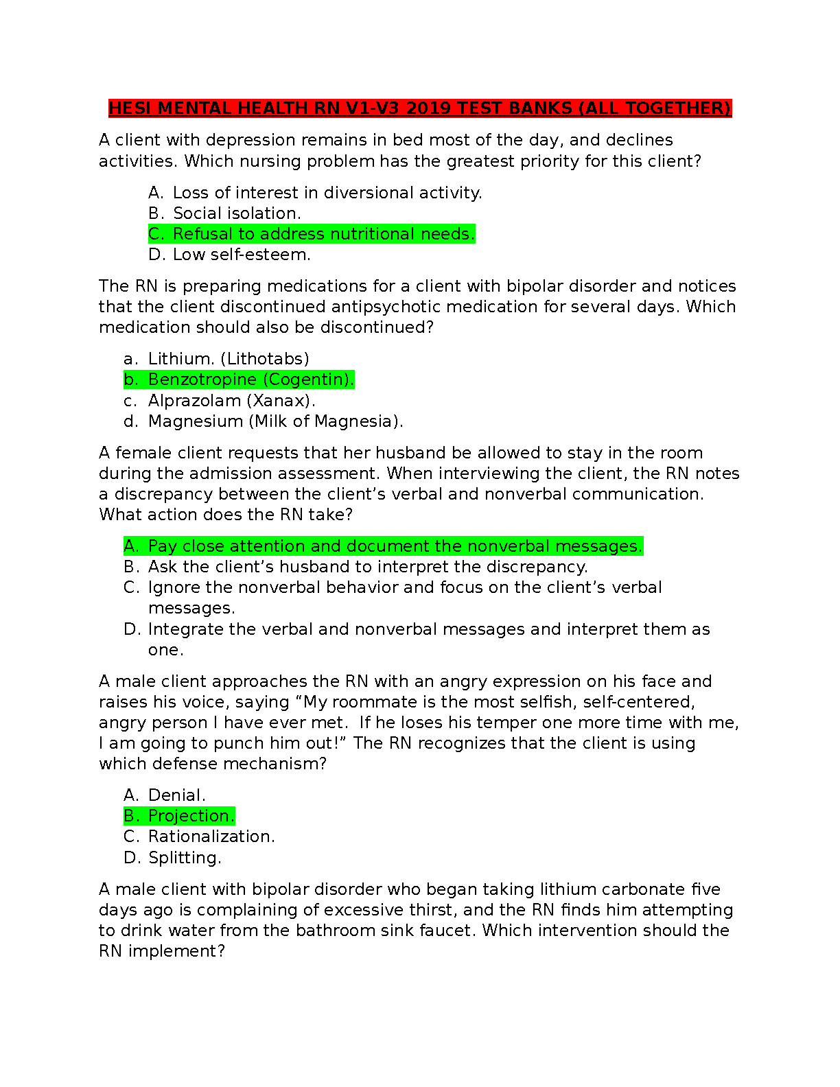 HESI Mental Health RN V1-V3 2019 Test Banks (All Together) by Authors: HESI