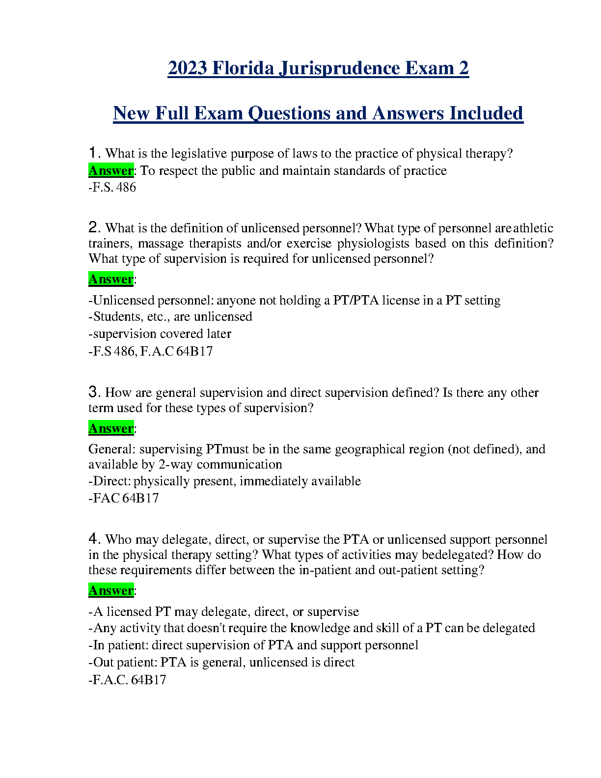 Get ready to ace the 2023 Florida Jurisprudence Exam 2 with this comprehensive study resource. This guide includes new full exam questions and answers, covering all aspects of the exam. Gain a clear understanding of the subject matter, practice your knowledge with realistic examples, and boost your confidence for success on your first attempt!