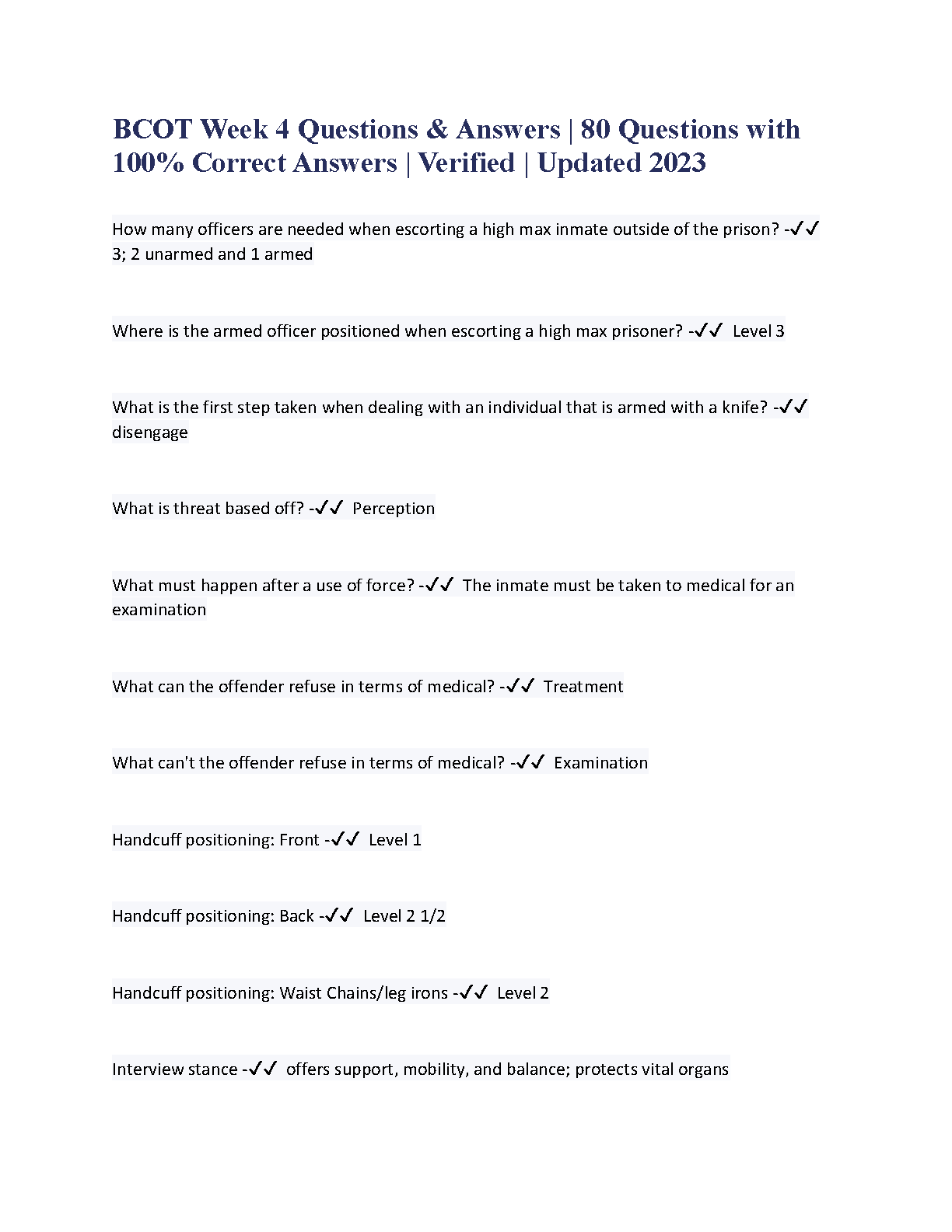 BCOT Week 4 Questions & Answers: 80 Questions with 100% Correct Answers - Verified | Updated 2023