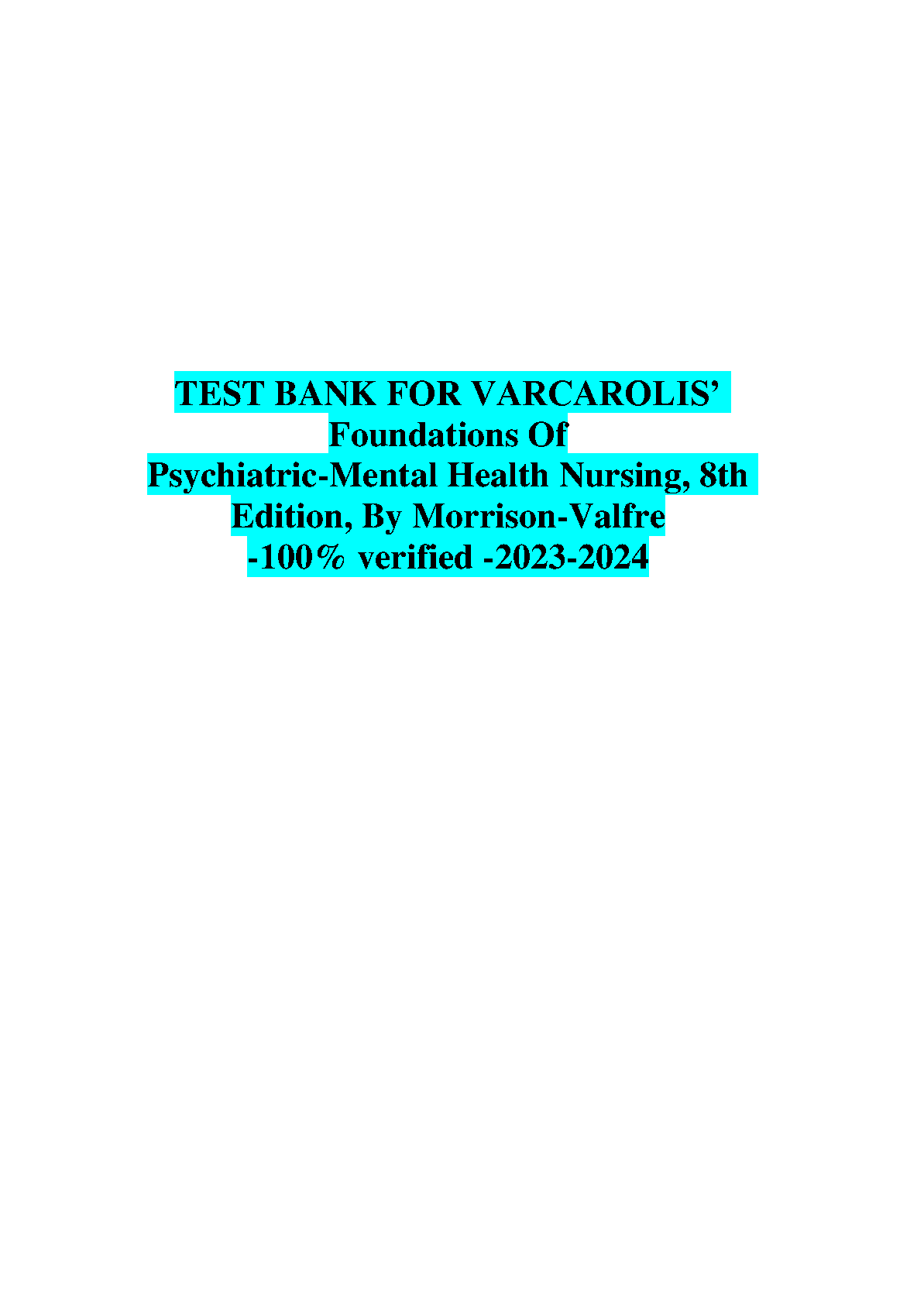 Ace your Psychiatric-Mental Health Nursing course with this comprehensive test bank covering the 8th edition of Foundations of Psychiatric-Mental Health Nursing by Morrison-Valfre. This verified resource is designed to help students master the key concepts and prepare for exams with confidence.