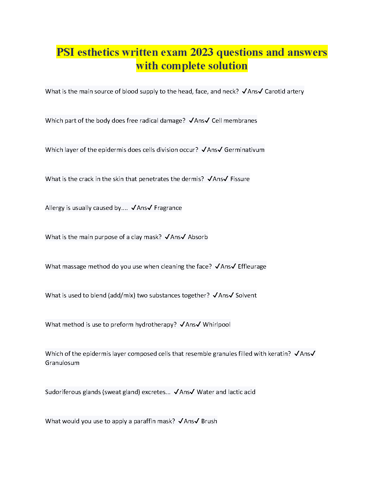 Download this PSI esthetics written exam questions and answers with complete solution and get a comprehensive study resource with detailed explanations to ace your esthetics exam. Boost your knowledge and confidence in esthetics principles.
