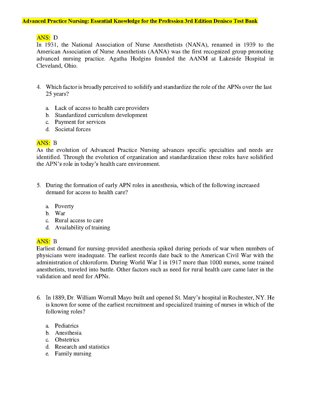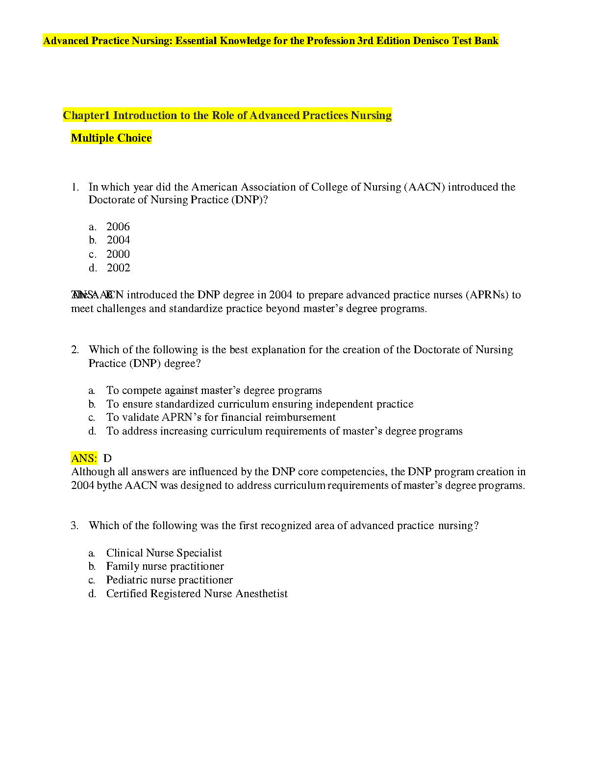 Ace your Advanced Practice Nursing exams with this comprehensive test bank! The 3rd edition of Advanced Practice Nursing: Essential Knowledge for the Profession by Susan M. Denisco and Anne M. Baker provides you with a complete set of practice questions and answers to help you prepare for success.