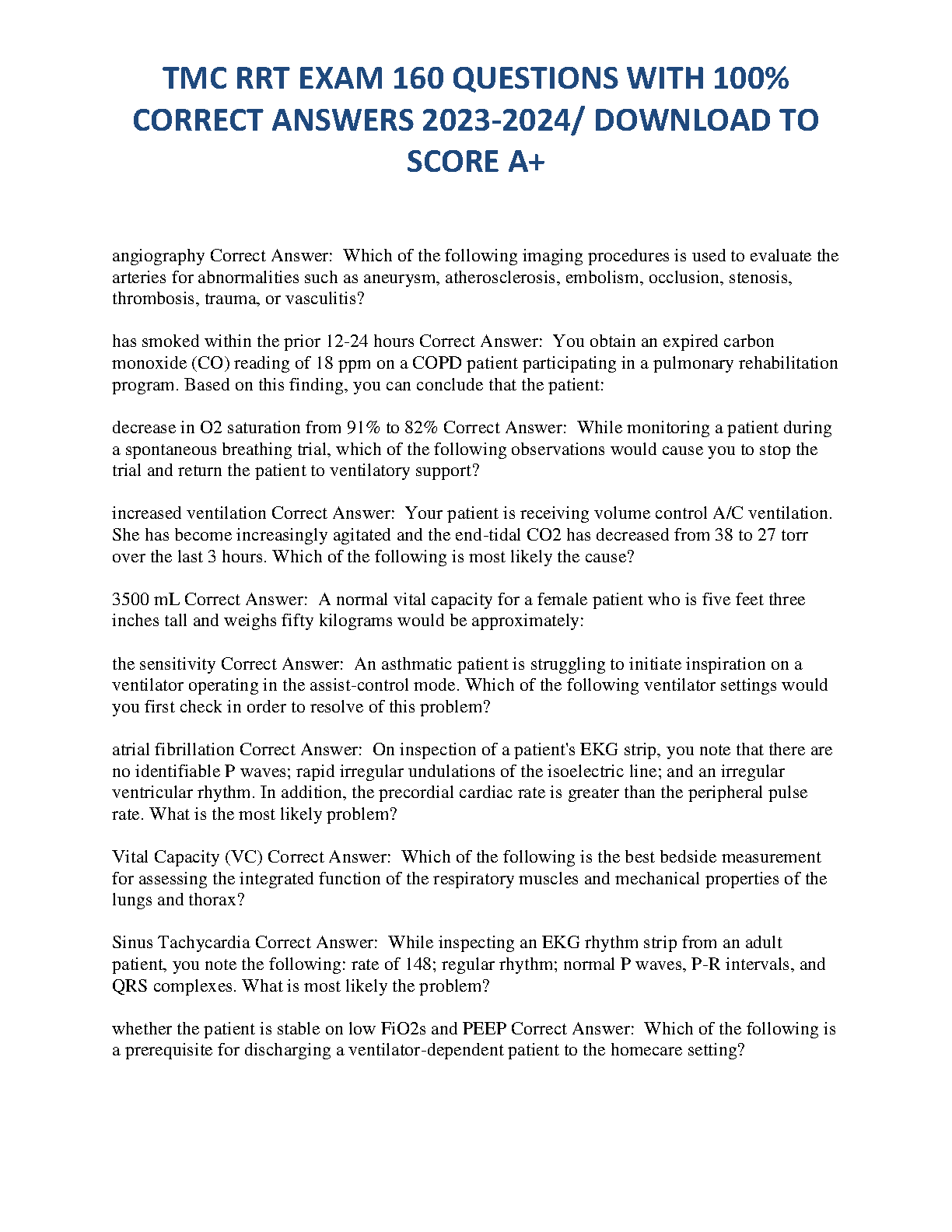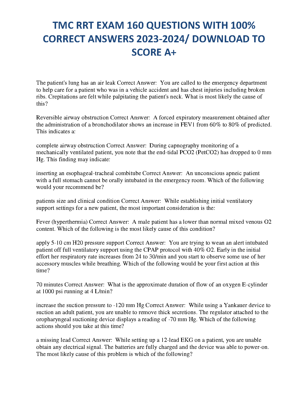 TMC RRT EXAM 160 Questions with 100% Correct Answers 2023-2024: Pass Your Exam on the First Attempt