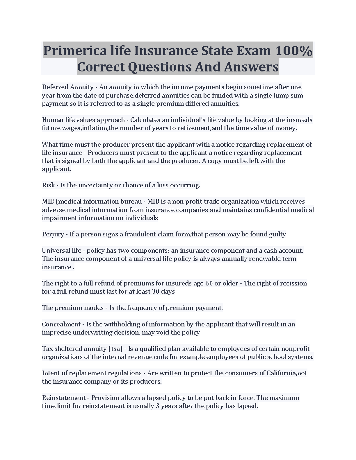 This resource contains a comprehensive collection of questions and answers covering the Primerica Life Insurance State Exam. These questions are designed to help students prepare for the exam and achieve a 100% passing score on their first attempt, avoiding resits.
