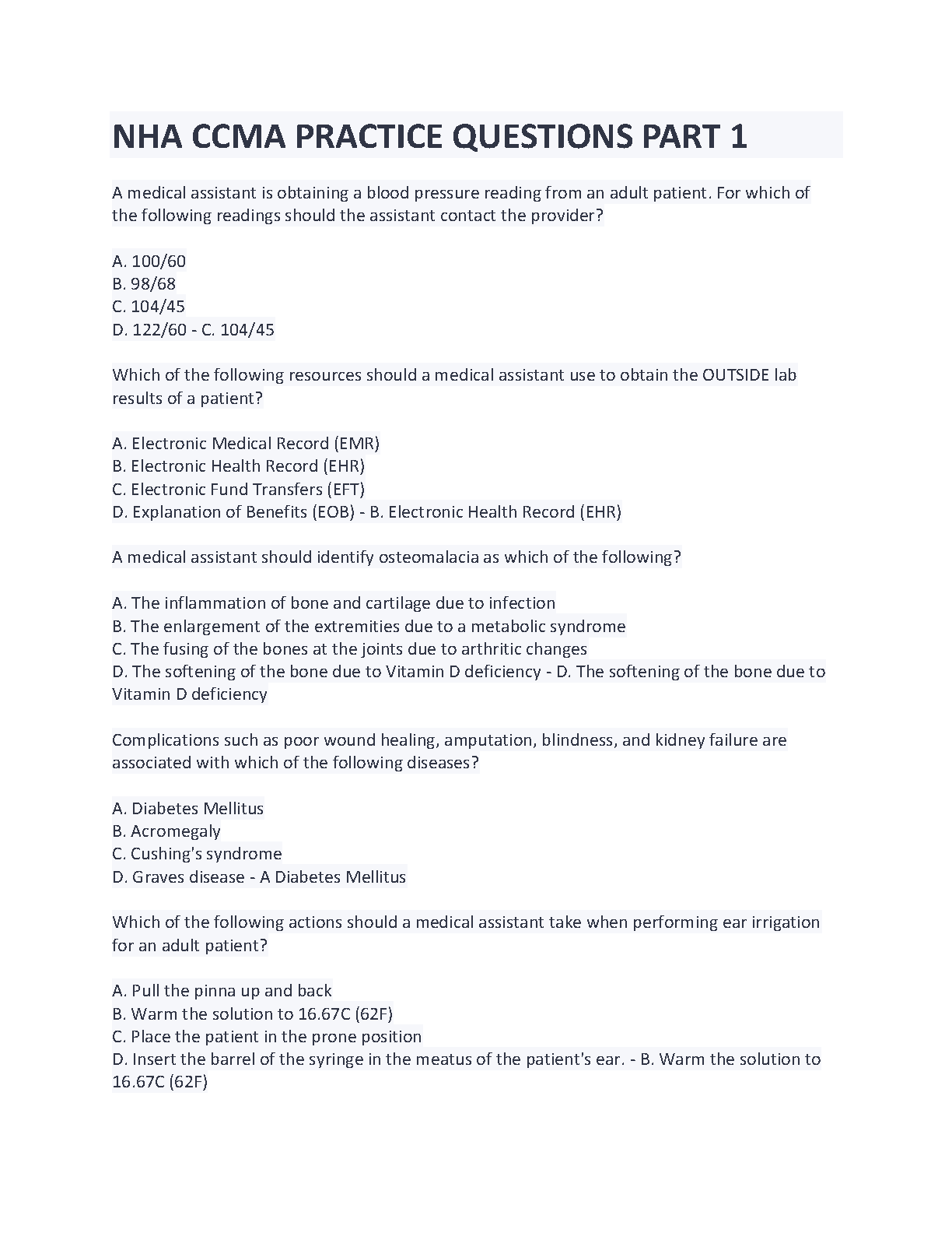 NHA CCMA Practice Questions Part 1 - Latest Edition for 2024/2025 Exams - Ace your First Attempt