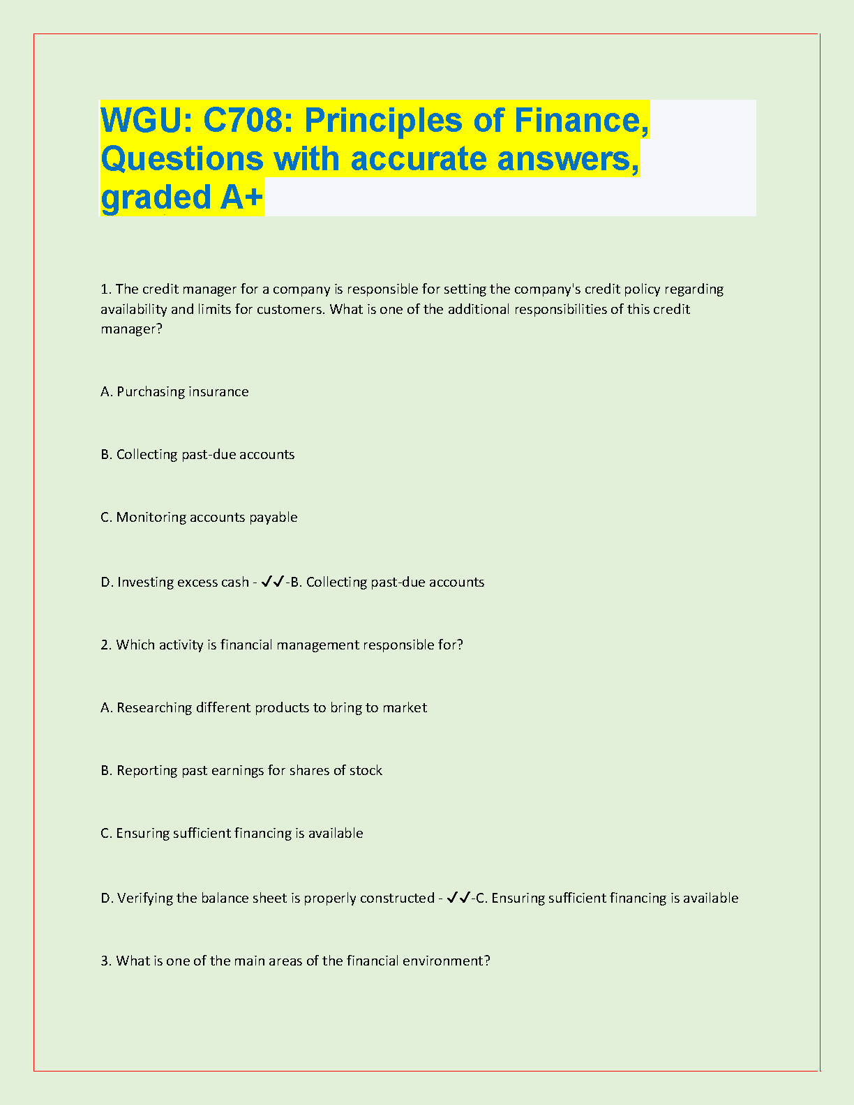 Pass your WGU C708: Principles of Finance exam with confidence using this resource. It includes graded questions with accurate answers to help you understand the key concepts of finance and prepare for success. This resource is perfect for students looking to ace their exam on the first attempt.