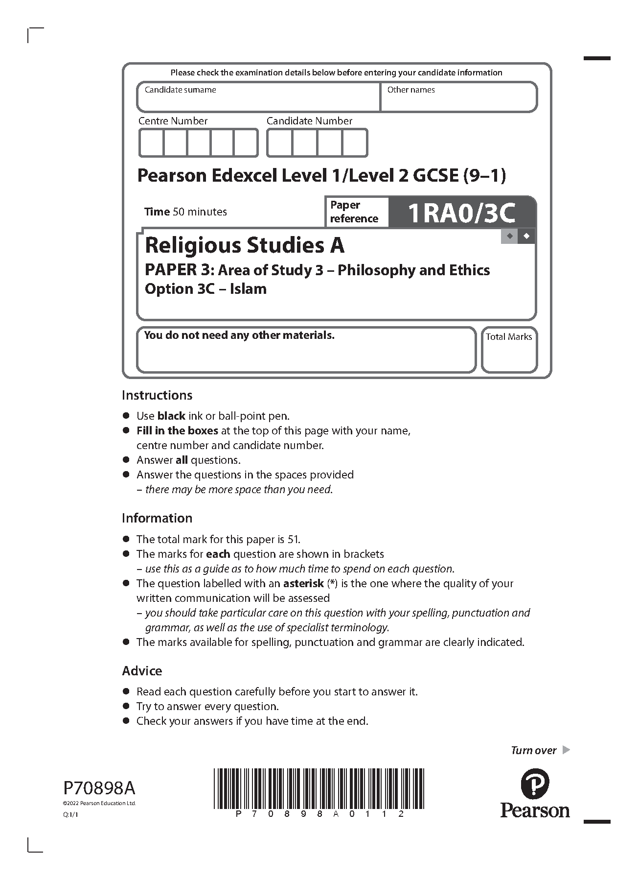 Mark Scheme (Results) Summer 2022 Pearson Edexcel GCSE In Religious Studies A (1RA0) Paper 2: Area of Study 2 - Study of Second Religion Option 2A: Catholic Christianity Edexcel and BTEC Qualification Pearson Edexcel GCSE In Religious Studies A (3RB0) (Short Course) Paper 1: Area of Study 1 Religion and Ethics Option 1B Christianity. Mark Scheme (Results) November 2021 Pearson Edexcel Merged Question Paper Mark Scheme (Results) Summer 2022 Pearson Edexcel GCSE In Religious Studies A (1RA0) Paper 4: Area of Study 4 – Textual Studies Option 4B: The Qur’an Pearson Edexcel Merged Question Paper Mark Scheme (Results) June 2022 Pearson Edexcel GCSE In Religious Studies A (1RA0) Paper 2: Area of Study 2 - Study of Second Religion Option 2E – Hinduism Pearson Edexcel Merged Question Paper Mark Scheme (Results) June 2022 Pearson Edexcel GCSE In Religious Studies A (1RA0) Paper 1: Area of Study 1 - Study of Religion Option 1A: Catholic Christianity Mark Scheme (Results) Summer 2022 Pearson Edexcel GCSE In Religious Studies A Short Course (3RA0) Paper 1: Area of Study 1- Study of Catholic Christianity Edexcel and BTEC Qualifications Mark Scheme (Results) Summer 2022 Pearson Edexcel GCSE In Religious Studies A (1RA0) Paper 4: Area of Study 4 – Textual Studies Option 4A: Mark’s Gospel Edexcel and BTEC Qualifications Pearson Edexcel Merged Question Paper Mark Scheme (Results) Summer 2022 Pearson Edexcel GCSE In Religious Studies A (1RA0) Paper 3: Area of Study 3 – Philosophy and Ethics Option 3C: Islam Mark Scheme (Results) Summer 2022 Pearson Edexcel GCSE In Religious Studies A Short Course (3RA0) Paper 4: Area of Study 4 Study of Judaism Edexcel and BTEC Qualifications Pearson Edexcel Merged Question Paper Mark Scheme (Results) Summer 2022 Pearson Edexcel GCSE In Religious Studies A (1RA0) Paper 3: Area of Study 3 – Philosophy and Ethics Option 3B: Christianity