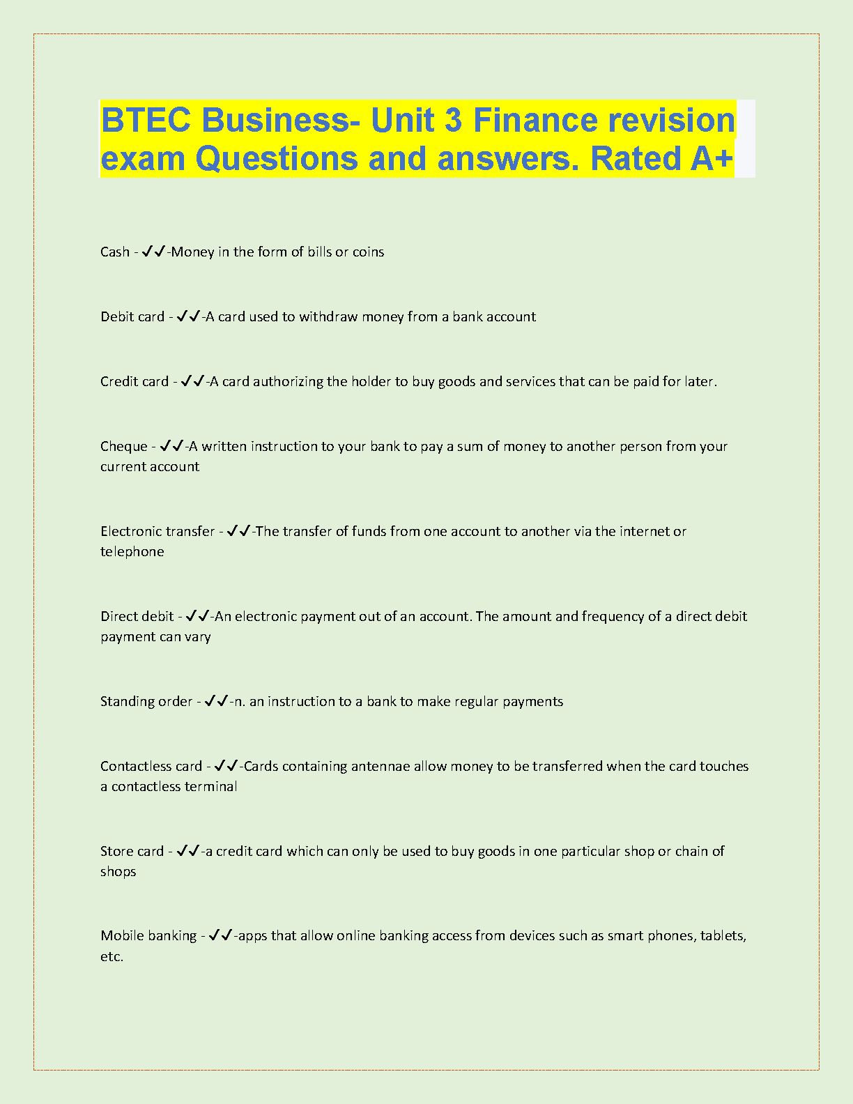 BTEC Business - Unit 3 Finance Revision Exam Questions and Answers Rated A+