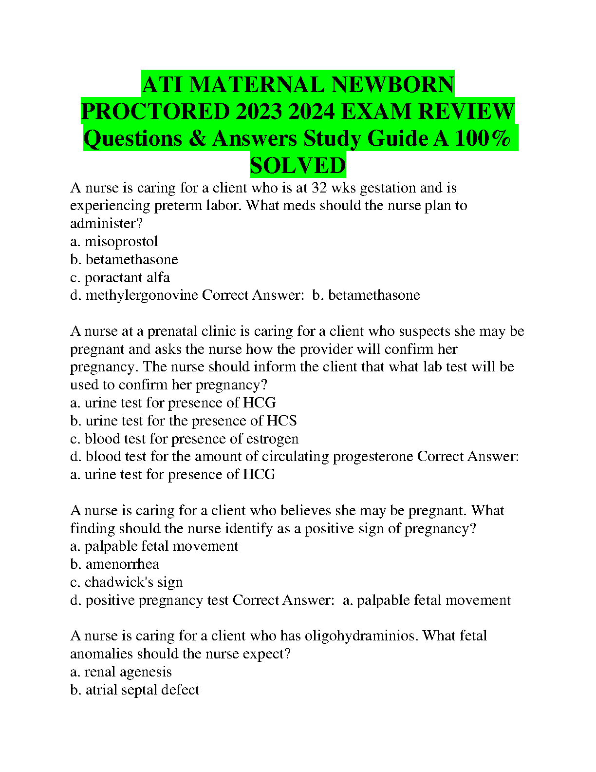 ATI Maternal Newborn Proctored 2023 2024 Exam Review Questions & Answers Study Guide A 100% Solved - by Linda Anne