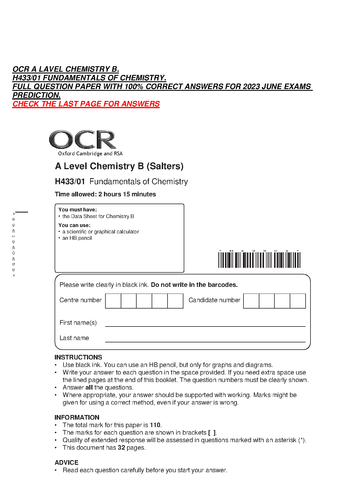 Ace your OCR A Level Chemistry B (Salters) H433/01 Fundamentals of Chemistry exam with our comprehensive solution manual. This resource provides complete answers and detailed explanations for every question in the 2024/2025 exam papers, ensuring you understand the concepts and can answer confidently.