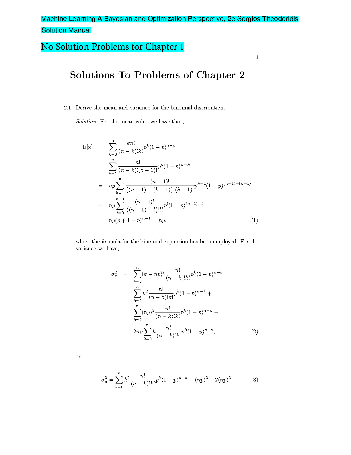 This solutions manual for Machine Learning: A Bayesian and Optimization Perspective, 2e provides comprehensive solutions to all the problems in the textbook. Written by expert instructors, these solutions are an invaluable resource for students who are looking to gain a deeper understanding of machine learning concepts and techniques. They help students avoid resits and boost their grades on the first attempt.