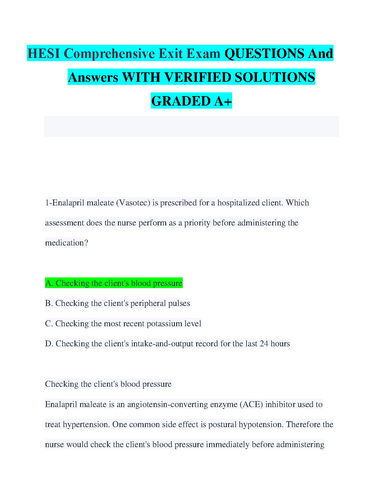 HESI Comprehensive Exit Exam Questions and Answers with Verified Solutions - Graded A+
