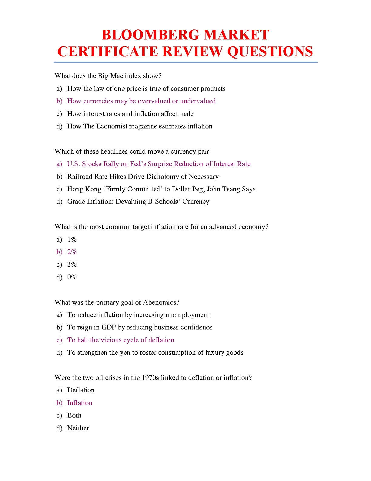 This resource contains review questions on the Bloomberg Market Certificate program. Prepare for your exam with these challenging multiple-choice questions covering key concepts and topics. These questions are a great way to test your understanding of the course material and identify areas where you need further study. Use these questions as a valuable tool in your exam preparation process.