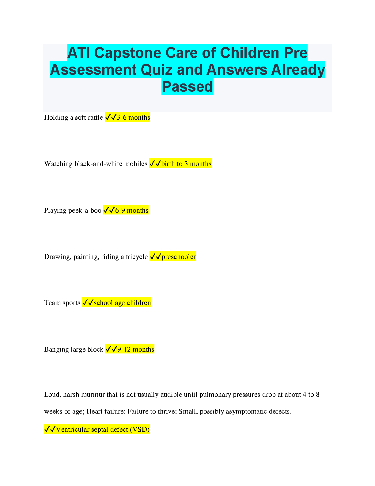 ATI Capstone Care of Children Pre Assessment Quiz and Answers Already Passed