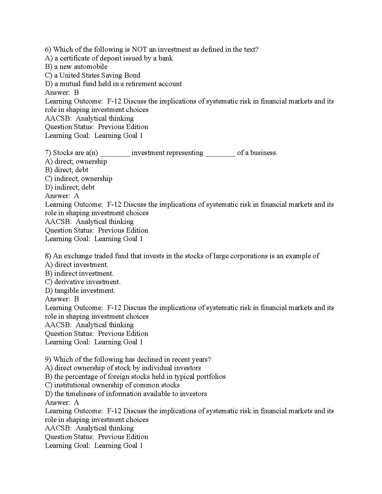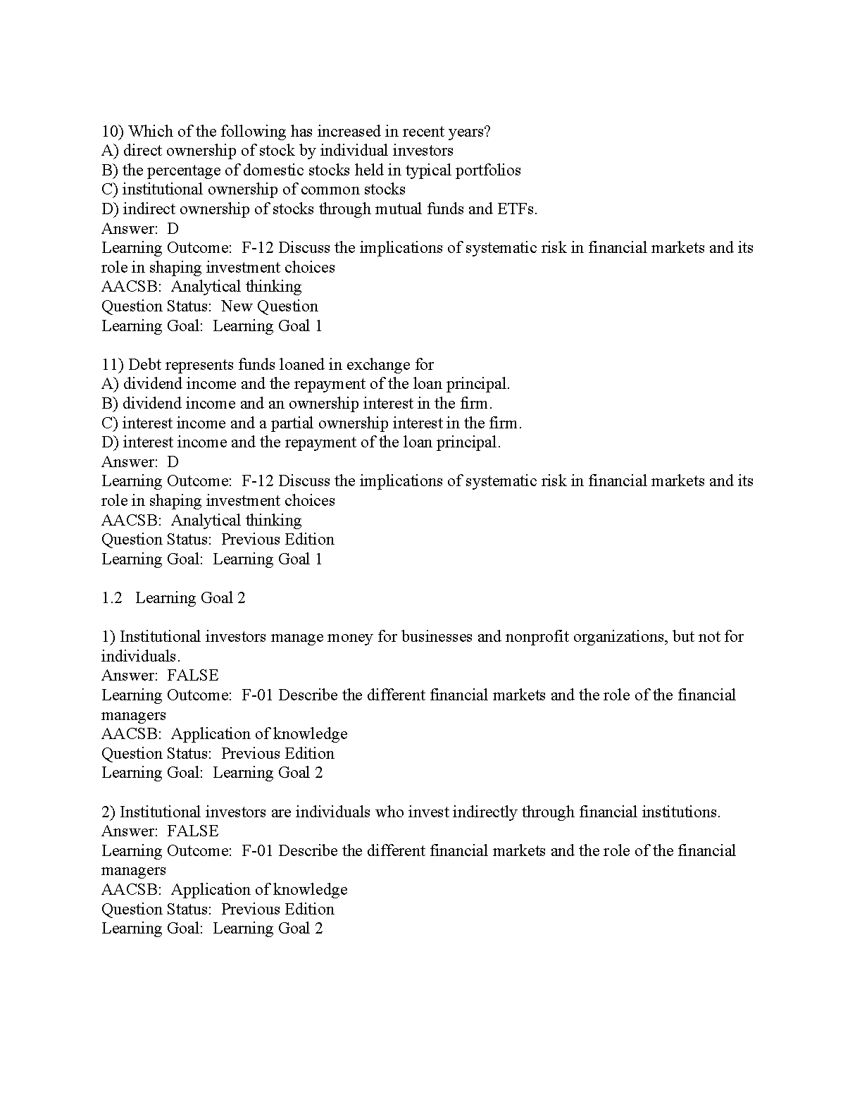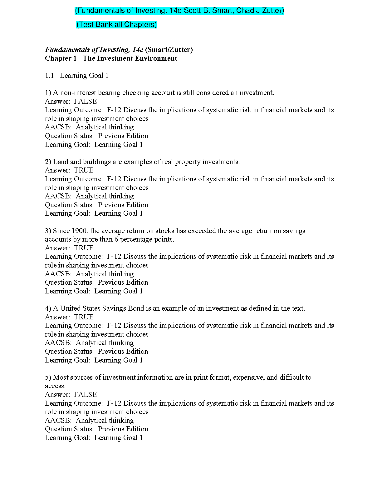 This comprehensive test bank is designed to help students prepare for their exams on Fundamentals of Investing, 14th Edition, by Scott B. Smart and Chad J. Zutter. It covers all chapters of the book, providing a wide range of multiple-choice, true/false, and short-answer questions that are aligned with the textbook's learning objectives. This resource is ideal for students looking to improve their understanding of investment concepts and strategies, and to maximize their chances of success on their first attempt.