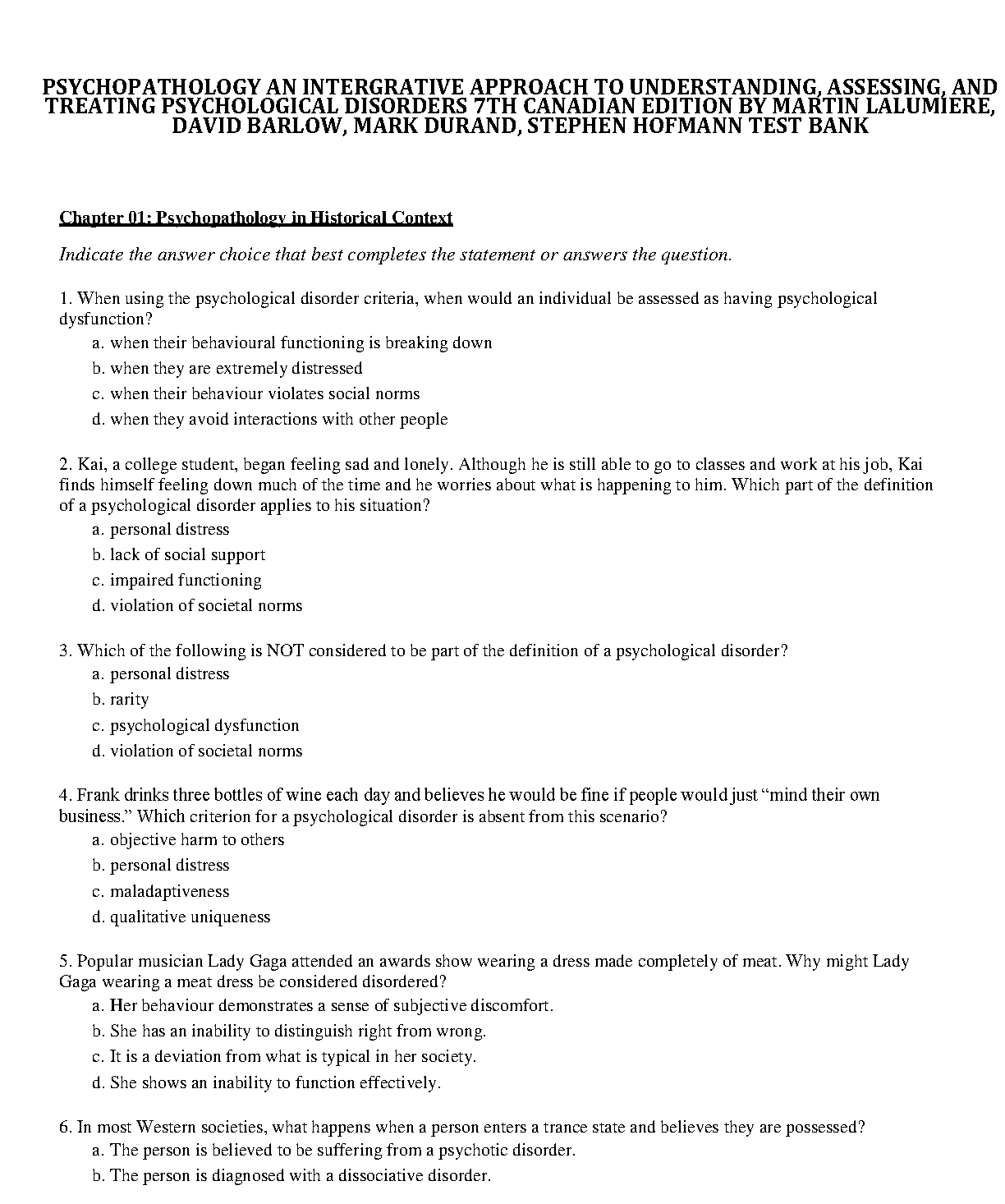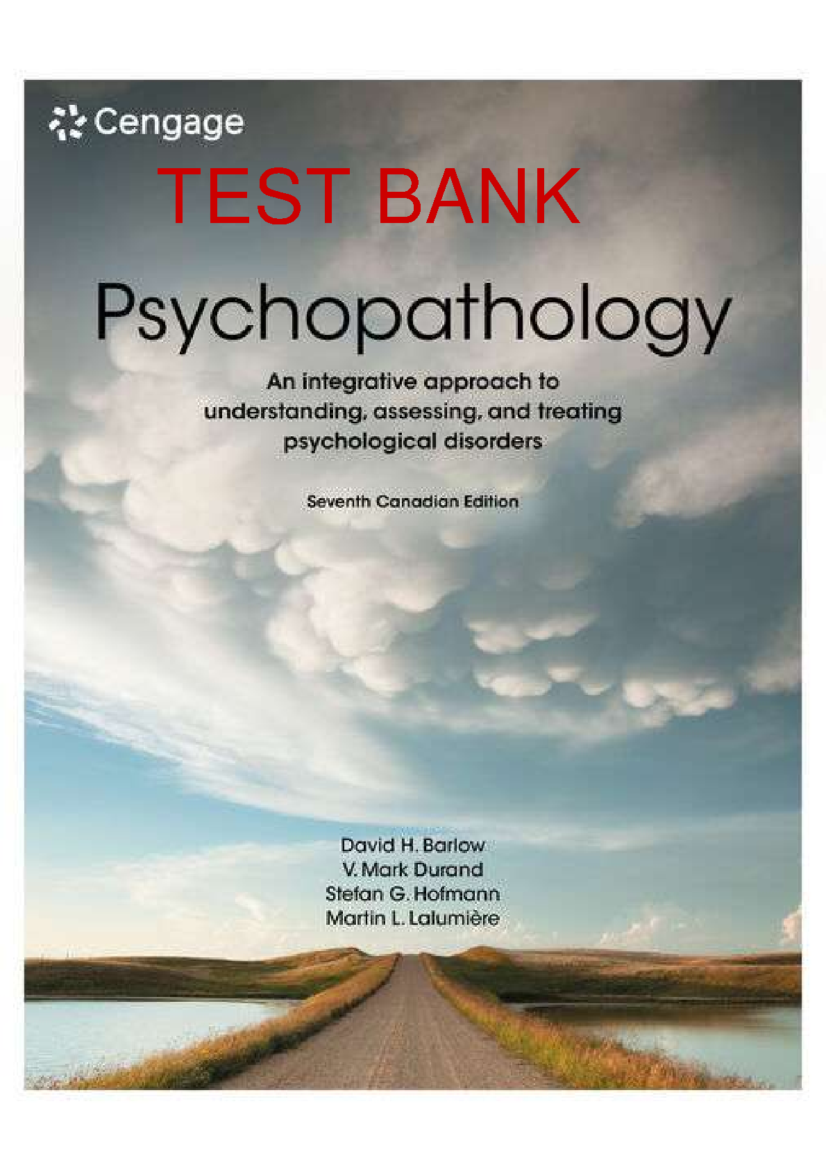 Test Bank for Psychopathology: An Integrative Approach to Understanding, Assessing, and Treating Psychological Disorders, 7th Canadian Edition by Barlow, Durand, Hofmann, & Lalumiere