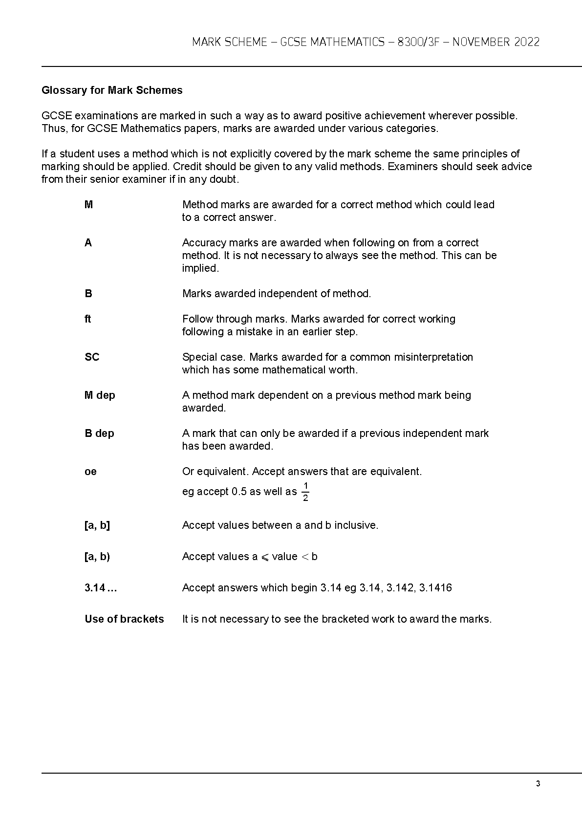 AQA GCSE Mathematics 8300/3F Foundation Tier Paper 3 Calculator Mark Scheme for November 2022. This resource provides the answers and marking guidance for the exam. Help your students achieve success on their first attempt!