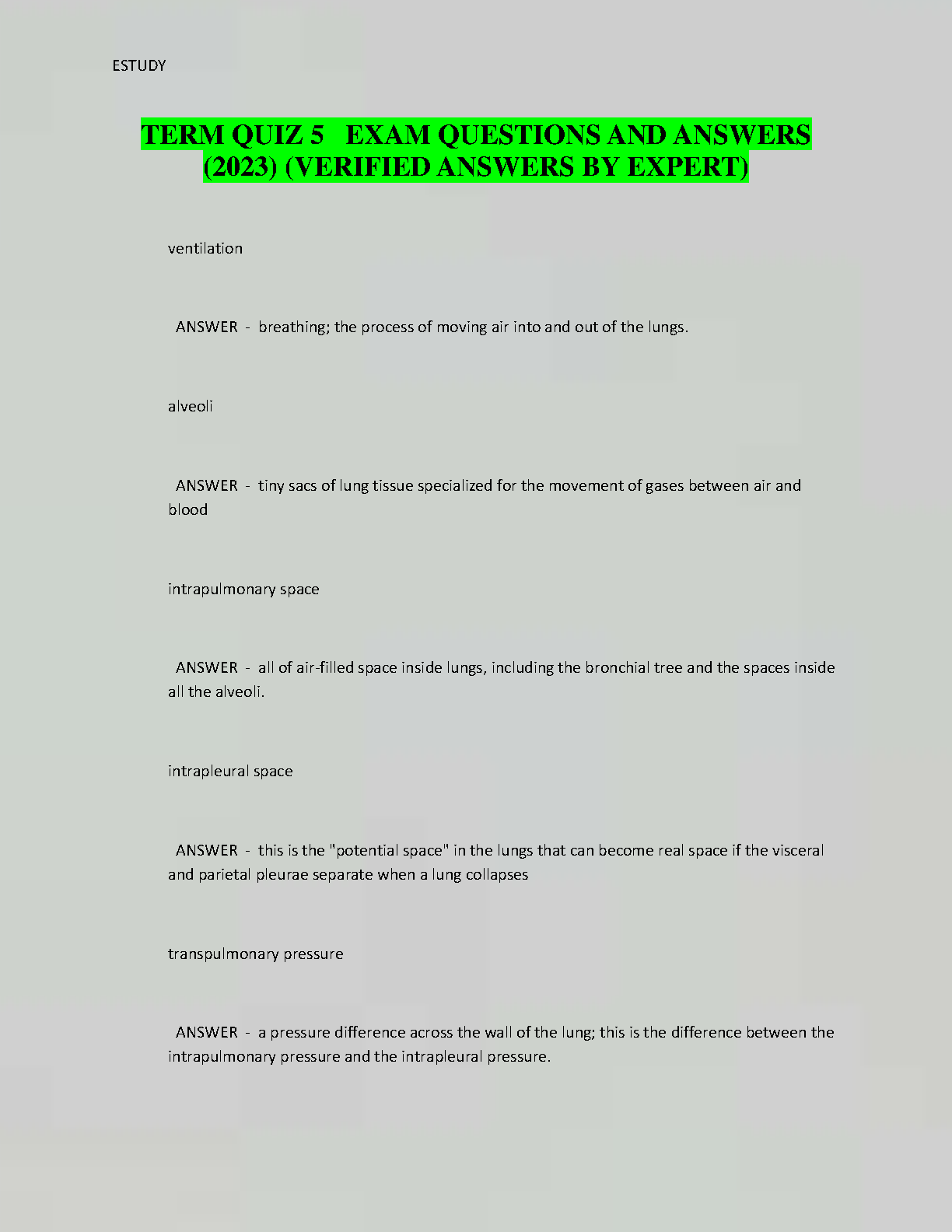 Ace your respiratory system exam with this comprehensive set of exam questions and answers! This resource, verified by experts, covers key concepts in ventilation, alveoli, intrapulmonary space, intrapleural space, and transpulmonary pressure. Get the edge you need to pass with confidence and avoid resits.