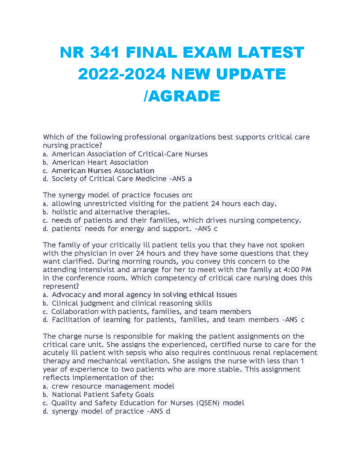 This comprehensive study guide, crafted for the latest NR 341 curriculum, empowers you to achieve mastery of critical care nursing concepts. Covering essential topics like professional organizations, ethical considerations, and patient care models, it's the ultimate resource to ensure exam success and a smooth transition to your nursing career.
