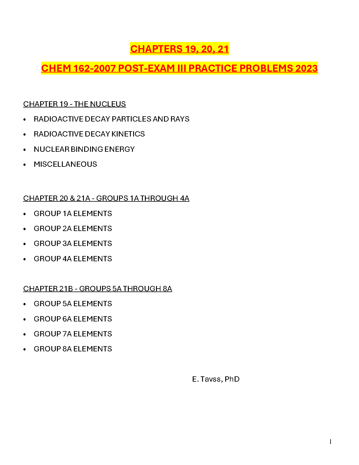 CHEM 162-2007 Post-Exam III Practice Problems 2023 by E. Tavss, PhD
