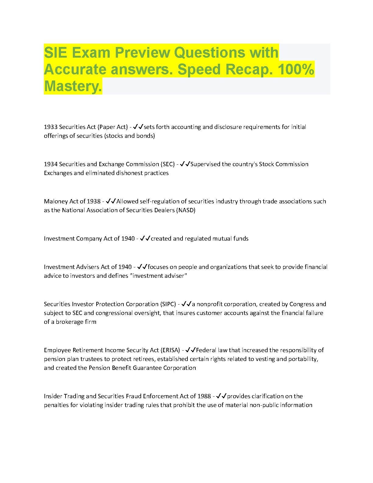 SIE Exam Preview Questions with Accurate Answers. Speed Recap. 100% Mastery.