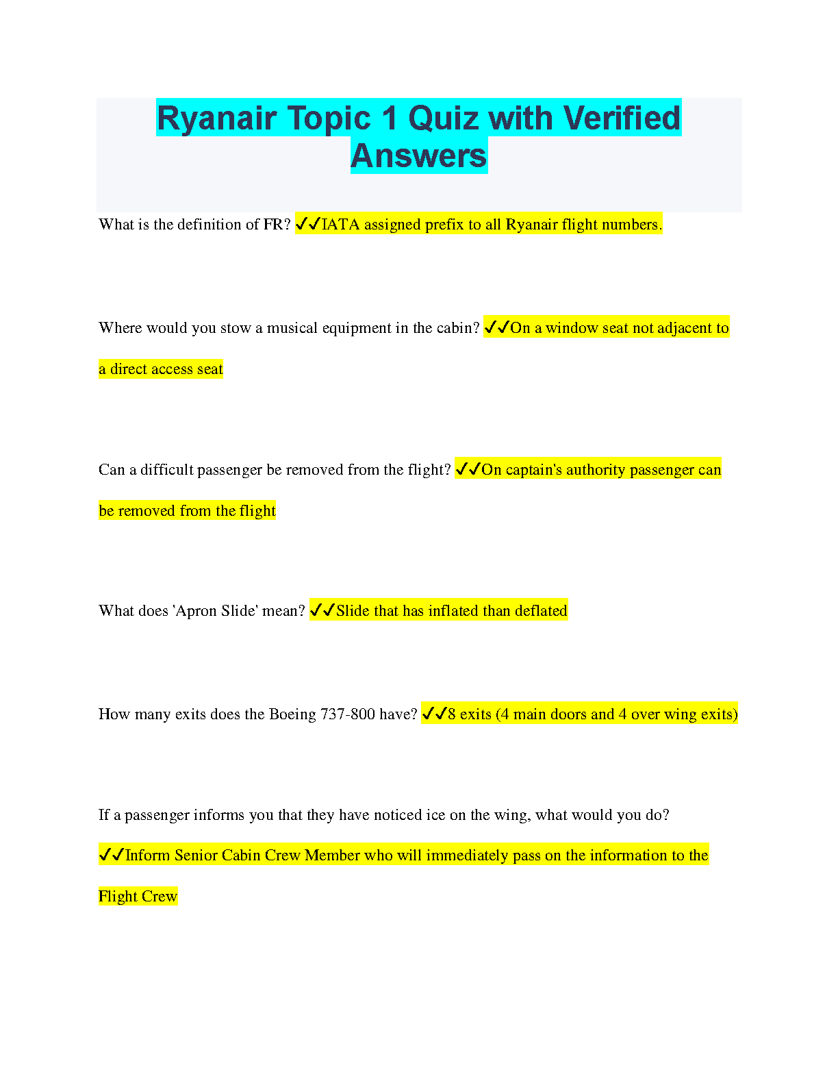 Ryanair Topic 1 Quiz with Verified Answers - A Comprehensive Guide to Pass your Exam on the First Attempt