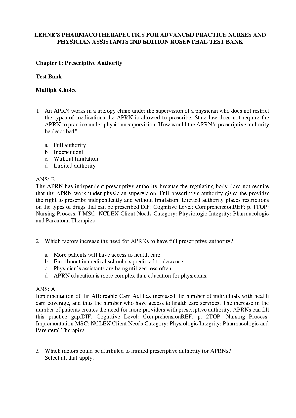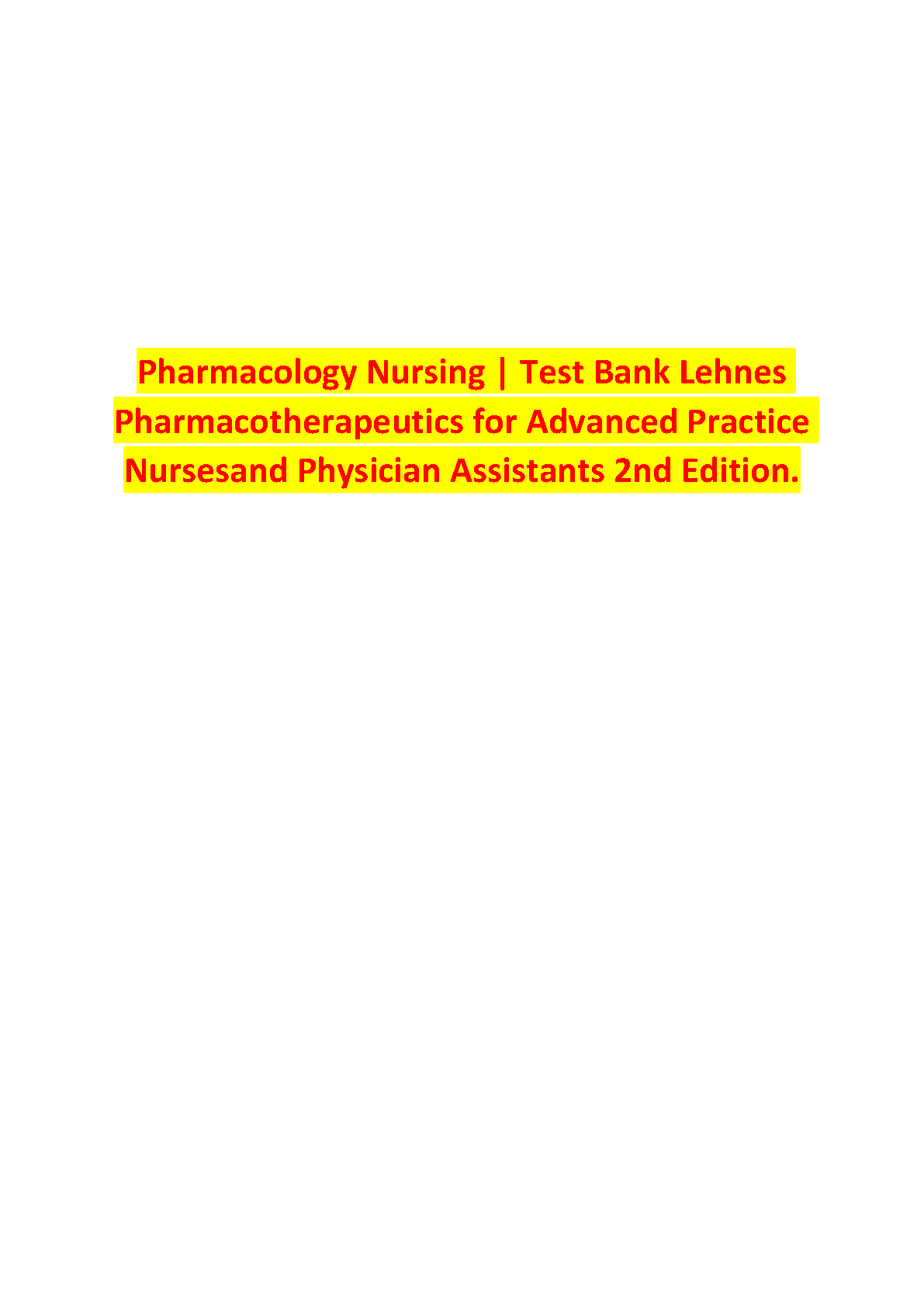 Pharmacology Nursing Test Bank for Lehnes Pharmacotherapeutics for Advanced Practice Nurses and Physician Assistants 2nd Edition