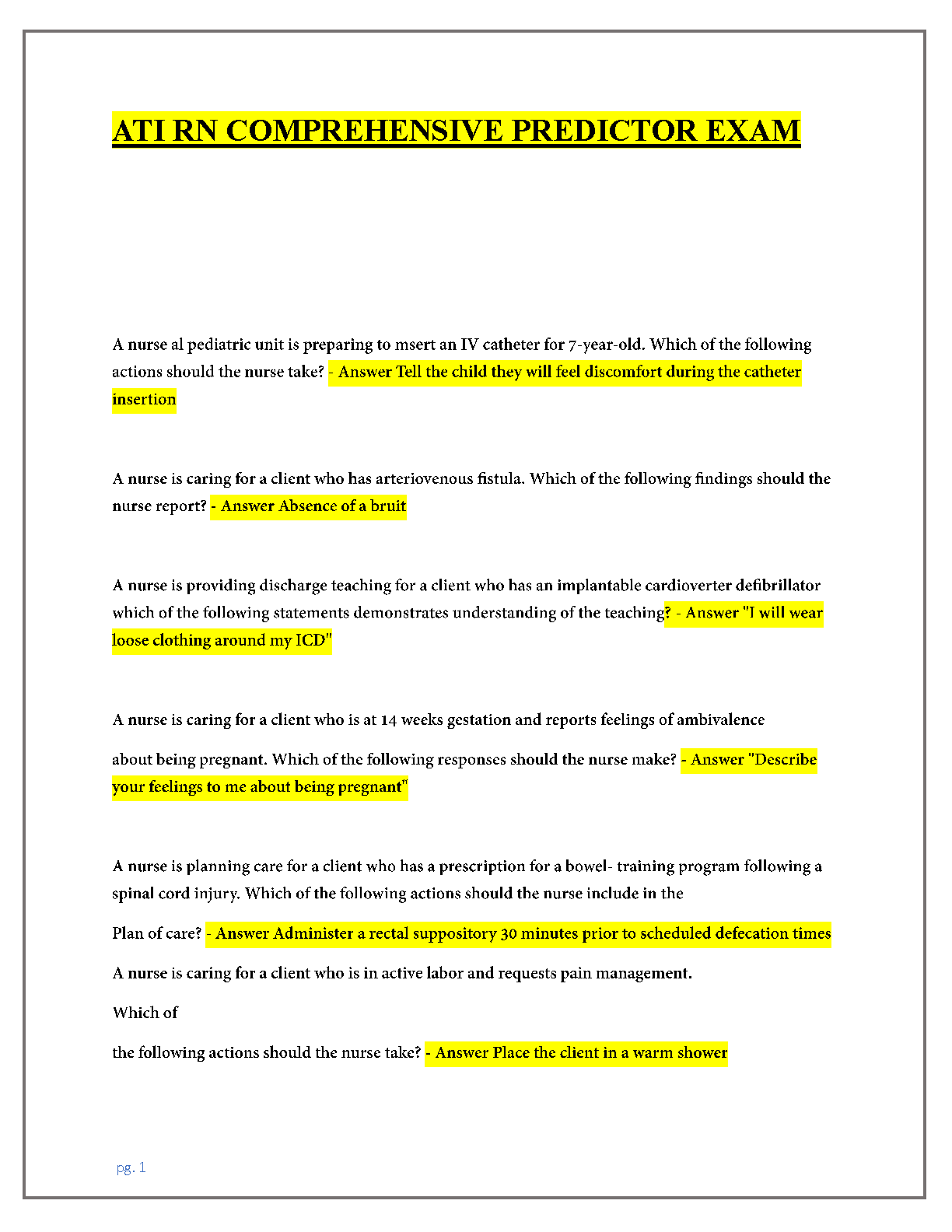Prepare for your upcoming ATI RN Comprehensive Predictor Exam with this comprehensive study guide, meticulously crafted to help you master the exam content and confidently ace it on your first attempt, eliminating the need for costly resits. This guide covers all essential nursing topics and includes practice questions with detailed explanations, giving you a complete overview of the exam.