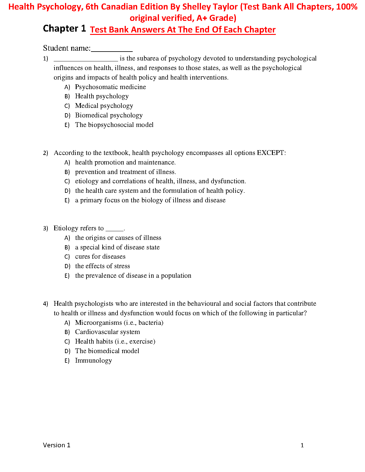 Access the complete Test Bank for Health Psychology, 6th Canadian Edition, authored by Shelley Taylor. This comprehensive resource includes all chapter answers, ensuring you achieve the best possible grade in your Health Psychology course.