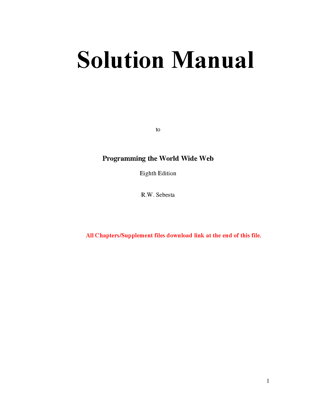 This is the solution manual for the 8th Edition of Programming the World Wide Web by Robert W. Sebesta. It provides complete solutions to all the exercises and problems in the textbook, allowing students to check their understanding and improve their problem-solving skills.