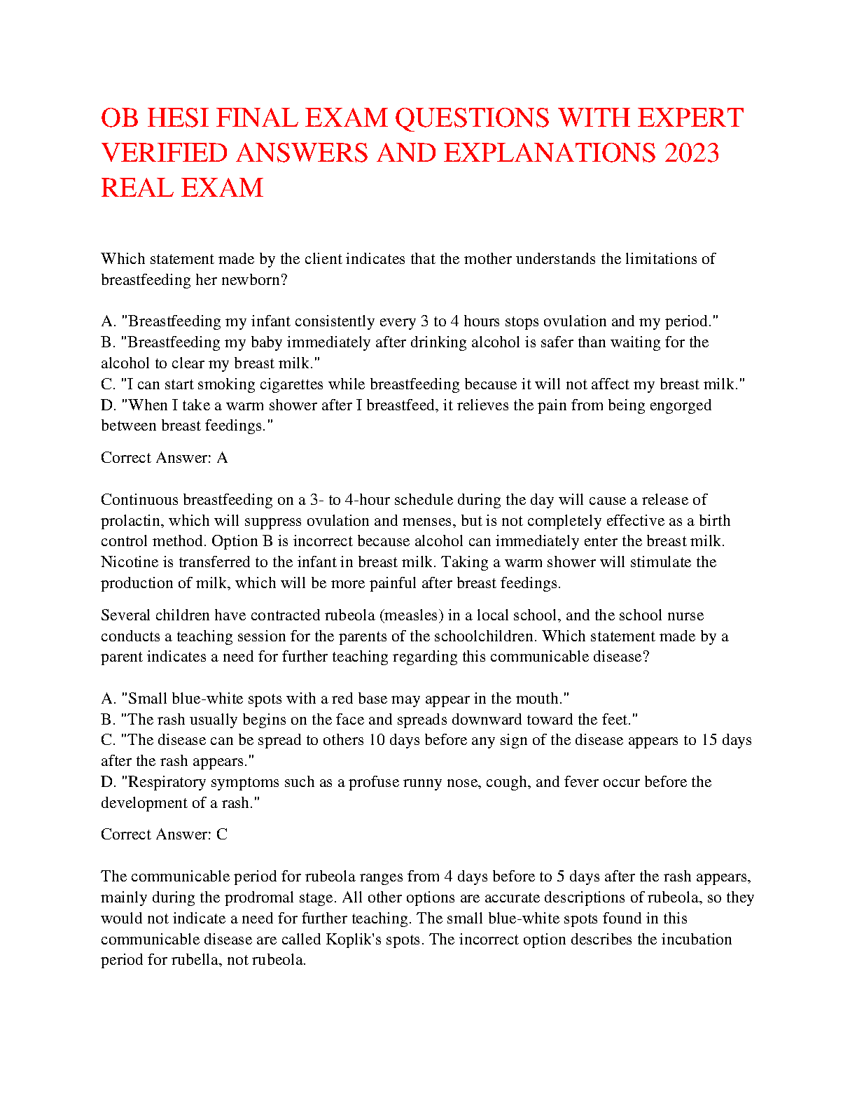 OB HESI Final Exam Questions with Expert Verified Answers and Explanations 2023