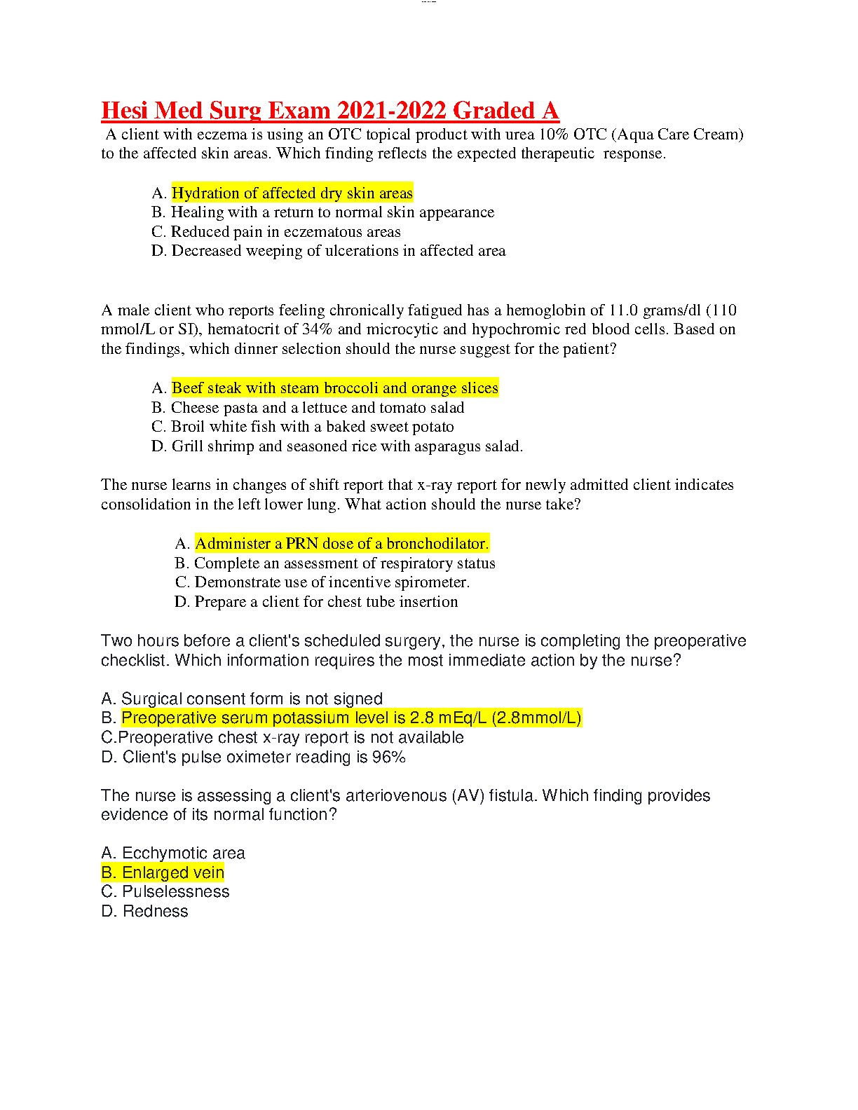 This comprehensive HESI Med Surg Exam 2021-2022 Graded A study guide is designed to help you master the essential concepts of medical-surgical nursing. It is packed with practice questions and detailed explanations, making it the perfect tool for maximizing your NCLEX-RN exam performance. Boost your knowledge, build confidence, and ace your exam on the first try, avoiding the stress and expense of retakes.